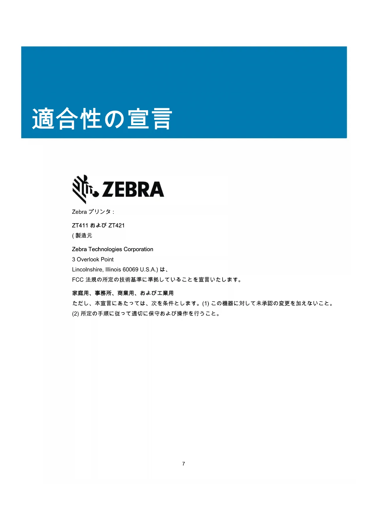 Zebra Technologies Corporation 3 Overlook Point Lincolnshire, Illinois 60069 U.S.A.) は、 FCC 法規の所定の技術基準に準拠していることを宣言いたします。 家庭用、事務所、商業用、および工業用 ただし、本宣言にあたっては、次を条件とします。(1) この機器に対して未承認の変更を加えないこと。 (2) 所定の手順に従って適切に保守および操作を行うこと。適合性の宣言