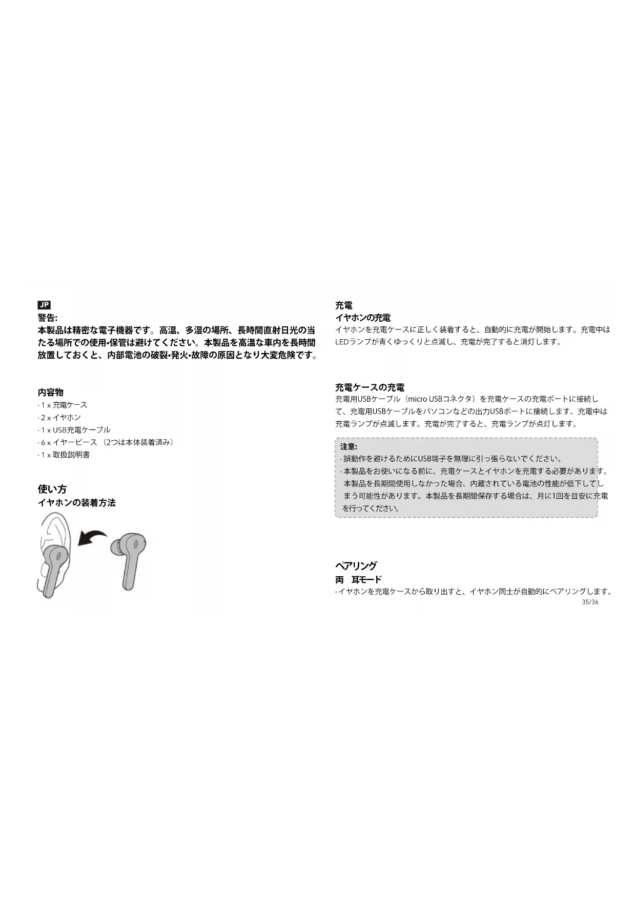 - 本製品をお使いになる前に、充電ケースとイヤホンを充電する必要があります。 本製品を長期間使用しなかった場合、内蔵されている電池の性能が低下してし まう可能性があります。本製品を長期間保存する場合は、月に1回を目安に充電