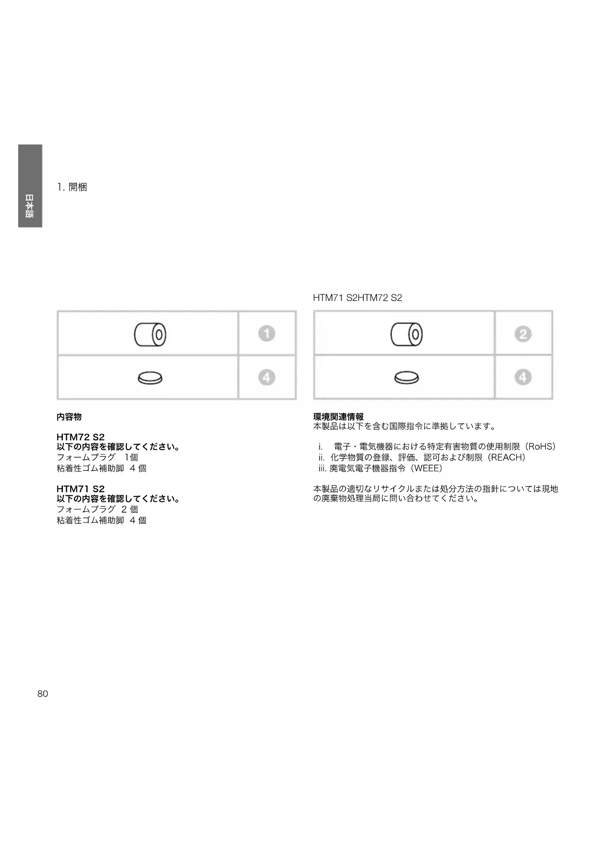 HTM72 S2 以下の内容を確認してください。 フォームプラグ 1個 粘着性ゴム補助脚 4 個 HTM71 S2 以下の内容を確認してください。 フォームプラグ 2 個 粘着性ゴム補助脚 4 個