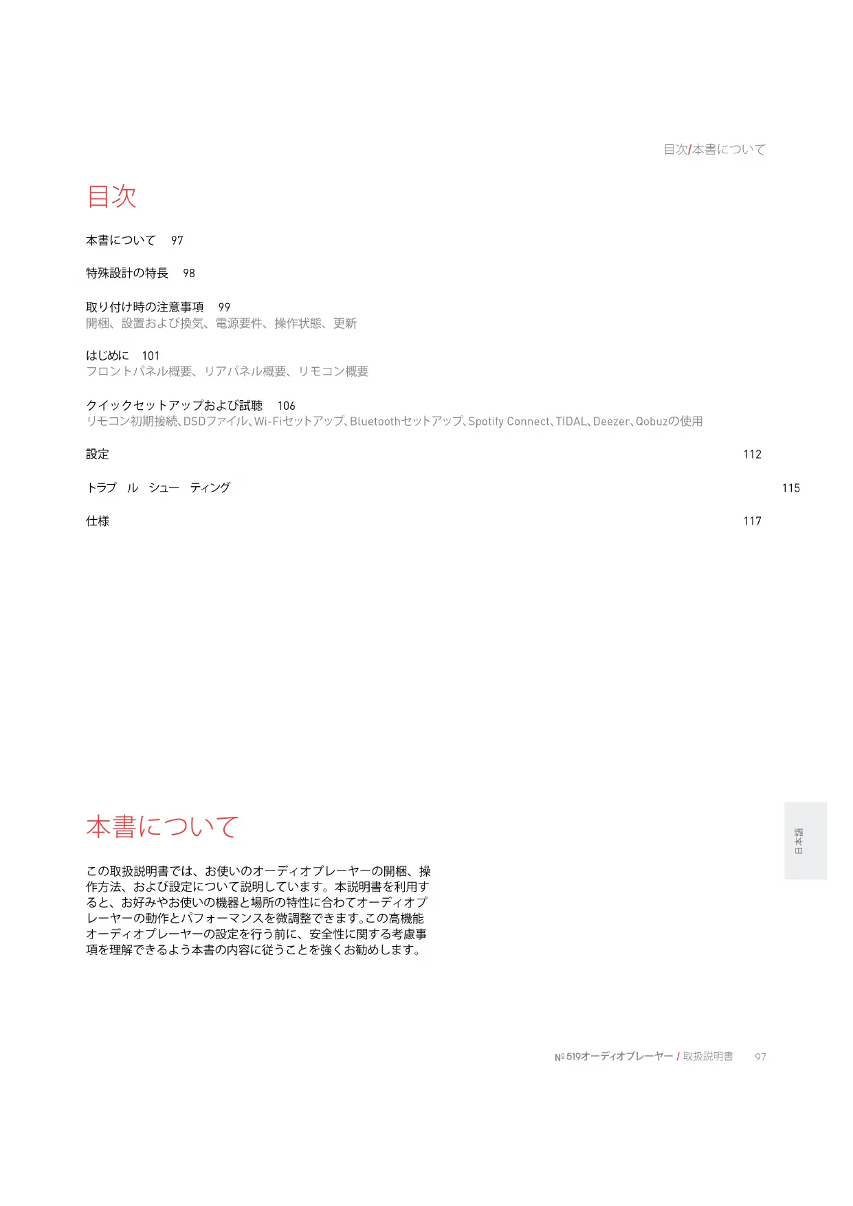 本書について 97 特殊設計の特長 98 取り付け時の注意事項 99 開梱、設置および換気、電源要件、操作状態、更新 はじめに 101 フロントパネル概要、リアパネル概要、リモコン概要 クイックセットアップおよび試聴 106 リモコン初期接続、DSDファイル 、Wi-Fiセットアップ、Bluetoothセットアップ、Spotify Connect、TIDAL、Deezer、Qobuzの使用 設定 112 トラブ ル シュー ティング 115 仕様 117 この取扱説明書では、お使いのオーディオプレーヤーの開梱、操 作方法、および設定について説明しています。本説明書を利用す ると、お好みやお使いの機器と場所の特性に合わてオーディオプ レーヤーの動作とパフォーマンスを微調整できます。この高機能 オーディオプレーヤーの設定を行う前に、安全性に関する考慮事 項を理解できるよう本書の内容に従うことを強くお勧めします。 本書について98