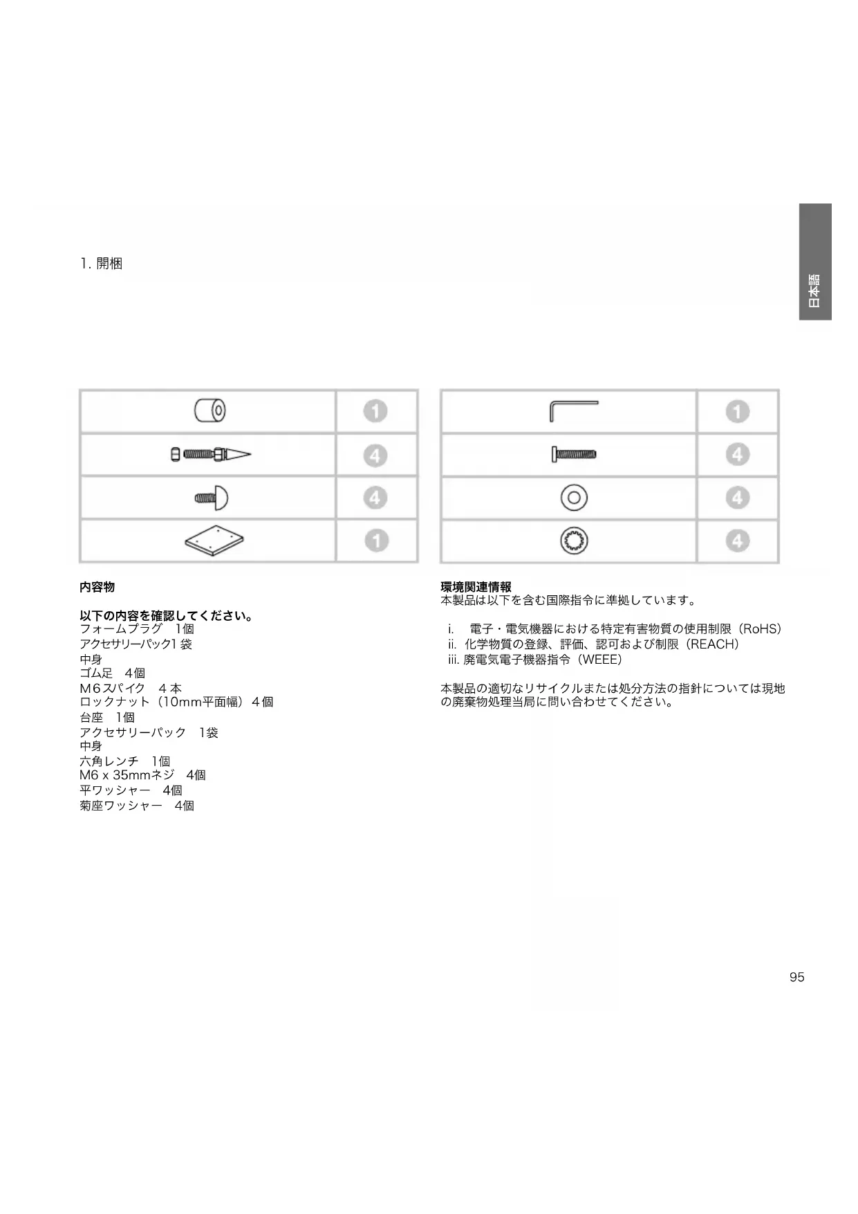 以下の内容を確認してください。 フォームプラグ 1個 アクセサリーパック1 袋