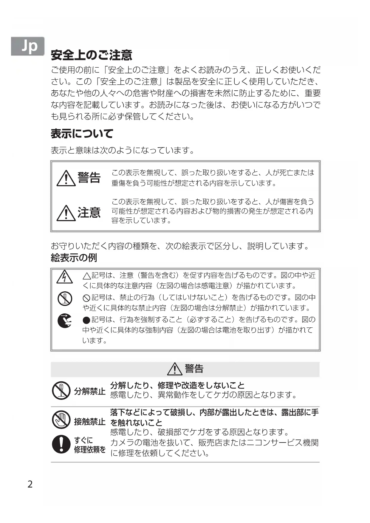 修理依頼を熱くなる、煙が出る、こげ臭いなどの異常時は、速やかにカメラの電池を取り出すことそのまま使用すると火災、やけどの原因となります。電池を取り出す際、やけどに充分注意してください。電池を抜いて、販売店またはニコンサービス機関に修理を依頼してください。 水かけ禁止水につけたり、水をかけたり、雨にぬらしたりしないこと発火したり感電の原因となります。