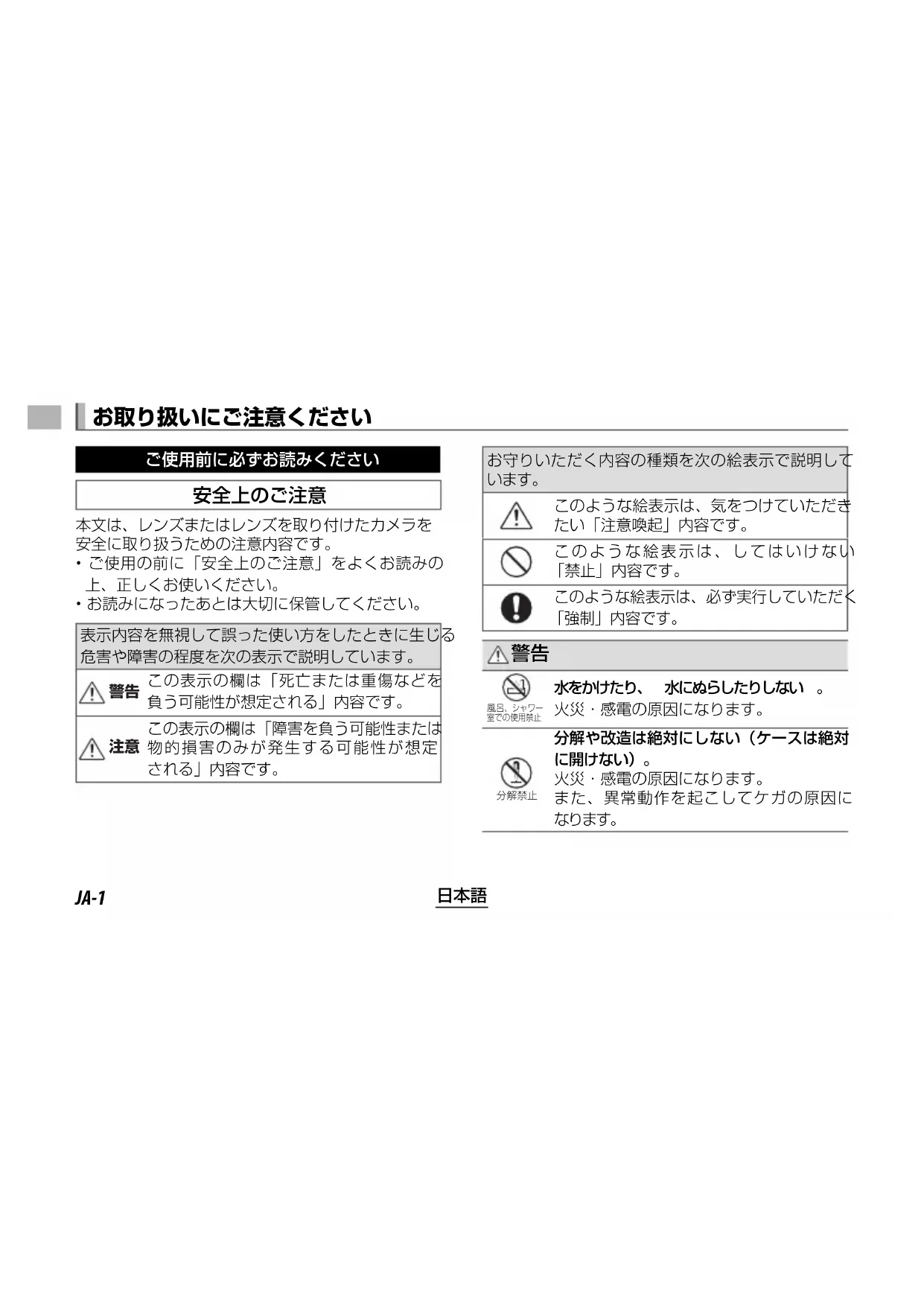 本文は、レンズまたはレンズを取り付けたカメラを 安全に取り扱うための注意内容です。