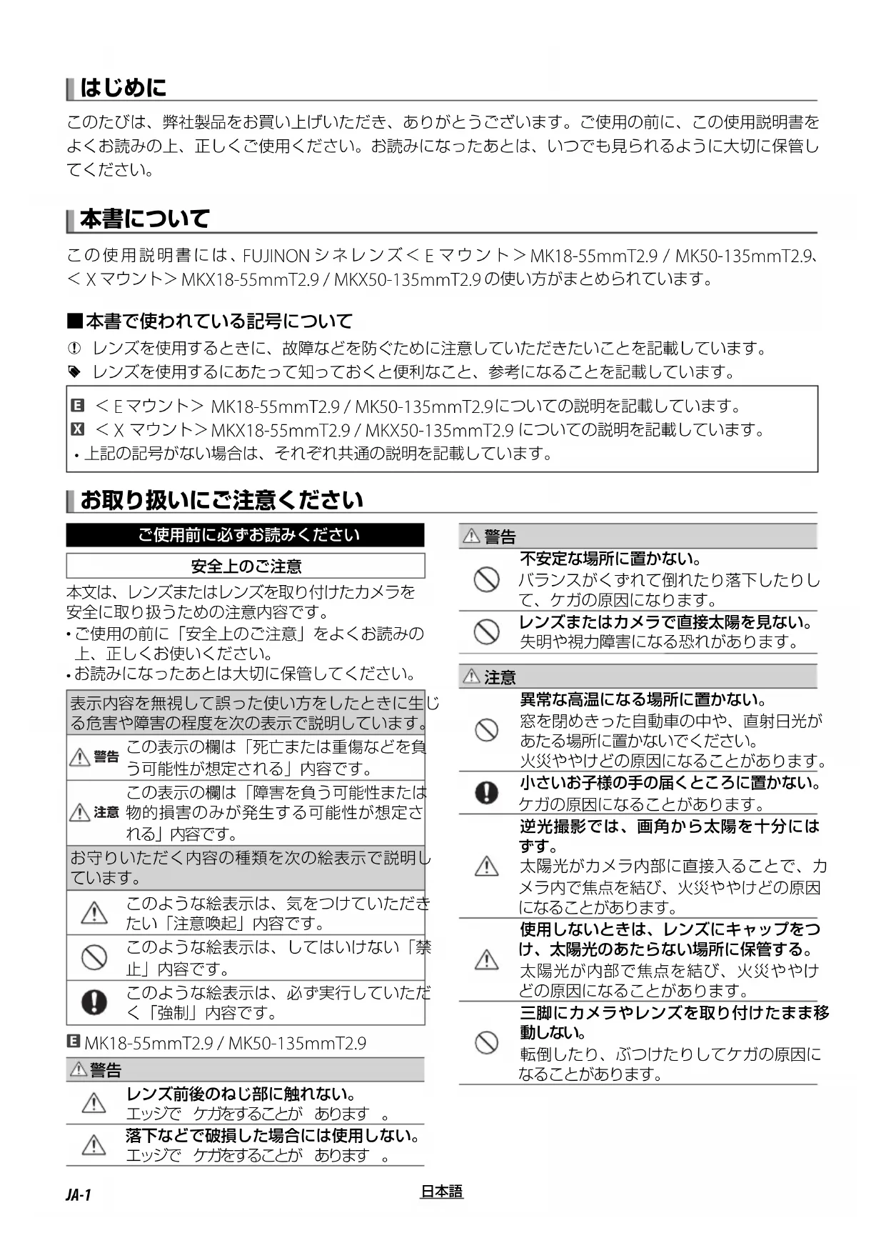 MKX18-55mmT2.9 / MKX50-135mmT2.9 についての説明を記載しています。 上記の記号がない場合は、それぞれ共通の説明を記載しています。 お取り扱いにご注意ください