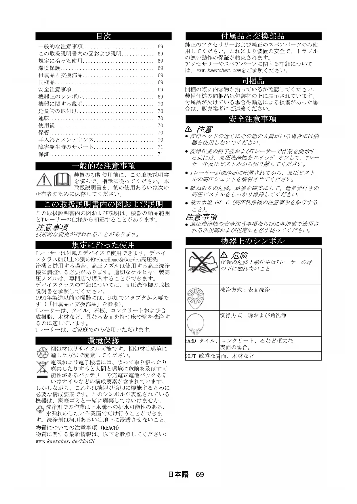 梱包材はリサイクル可能です。梱包材は環境に 適した方法で廃棄してください。 電気および電子機器には、誤って取り扱ったり 廃棄したりすると人間と環境に危険を及ぼす可 能性があるバッテリーや充電式電池パックある いはオイルなどの構成要素が含まれています。 しかしながら、これらは機器が適切に機能するために 必要な構成要素です。このシンボルが表記されている 機器は、家庭ゴミと一緒に廃棄してはいけません。 洗浄剤での作業は下水溝への排水可能性のある、 水漏れのしない作業面でだけ行うことができま す。洗浄剤は河川あるいは地下に浸透させないこと。 物質についての注意事項 (REACH) 物質に関する最新情報は、以下を参照してください: www.kaercher.de/REACH