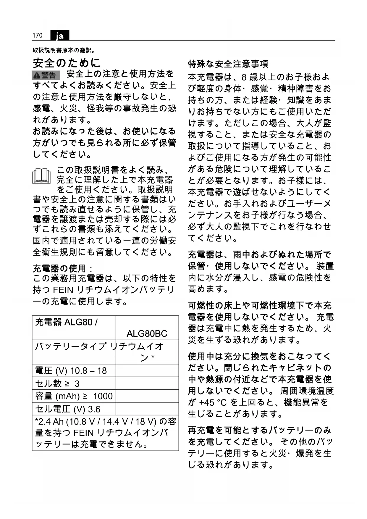 この取扱説明書をよく読み、 完全に理解した上で本充電器 をご使用ください。取扱説明 書や安全上の注意に関する書類はい つでも読み直せるように保管し、充 電器を譲渡または売却する際には必 ずこれらの書類も添えてください。 国内で適用されている一連の労働安 全衛生規則にも留意してください。