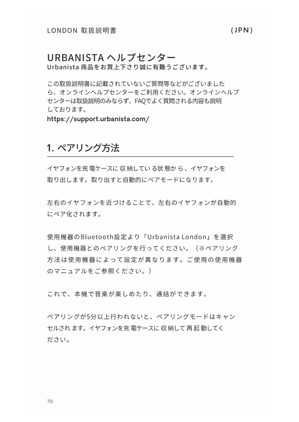 LONDON 取扱説明書 URBANISTA ヘルプセンター Urbanista 商品をお買上下さり誠に有難うございます。 この取扱説明書に記載されていないご質問等などがございました ら、オンラインヘルプセンターをご利用ください。オンラインヘルプ センターは取扱説明のみならず、FAQでよく質問される内容も説明