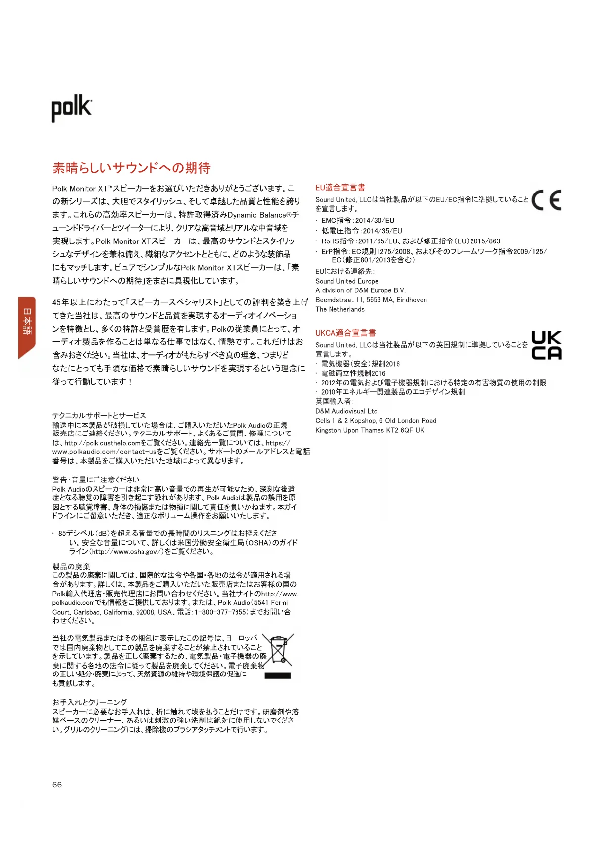 PУССКИЙ素晴らしいサウンドへの期待 Polk Monitor XT™スピーカーをお選びいただきありがとうございます。こ の新シリーズは、大胆でスタイリッシュ、そして卓越した品質と性能を誇り ます。これらの高効率スピーカーは、特許取得済みDynamic Balance®チ ューンドドライバーとツイーターにより、クリアな高音域とリアルな中音域を 実現します。Polk Monitor XTスピーカーは、最高のサウンドとスタイリッ シュなデザインを兼ね備え、繊細なアクセントとともに、どのような装飾品 にもマッチします。ピュアでシンプルなPolk Monitor XTスピーカーは、「素 晴らしいサウンドへの期待」をまさに具現化しています。 45年以上にわたって「スピーカースペシャリスト」としての評判を築き上げ てきた当社は、最高のサウンドと品質を実現するオーディオイノベーショ ンを特徴とし、多くの特許と受賞歴を有します。Polkの従業員にとって、オ ーディオ製品を作ることは単なる仕事ではなく、情熱です。これだけはお 含みおきください。当社は、オーディオがもたらすべき真の理念、つまりど なたにとっても手頃な価格で素晴らしいサウンドを実現するという理念に 従って行動しています! テクニカルサポートとサービス 輸送中に本製品が破損していた場合は、ご購入いただいたPolk Audioの正規 販売店にご連絡ください。テクニカルサポート、よくあるご質問、修理について は、http://polk.custhelp.comをご覧ください。連絡先一覧については、https:// www.polkaudio.com/contact-usをご覧ください。サポートのメールアドレスと電話 番号は、本製品をご購入いただいた地域によって異なります。 警告:音量にご注意ください Polk Audioのスピーカーは非常に高い音量での再生が可能なため、深刻な後遺 症となる聴覚の障害を引き起こす恐れがあります。Polk Audioは製品の誤用を原 因とする聴覚障害、身体の損傷または物損に関して責任を負いかねます。本ガイ ドラインにご留意いただき、適正なボリューム操作をお願いいたします。
