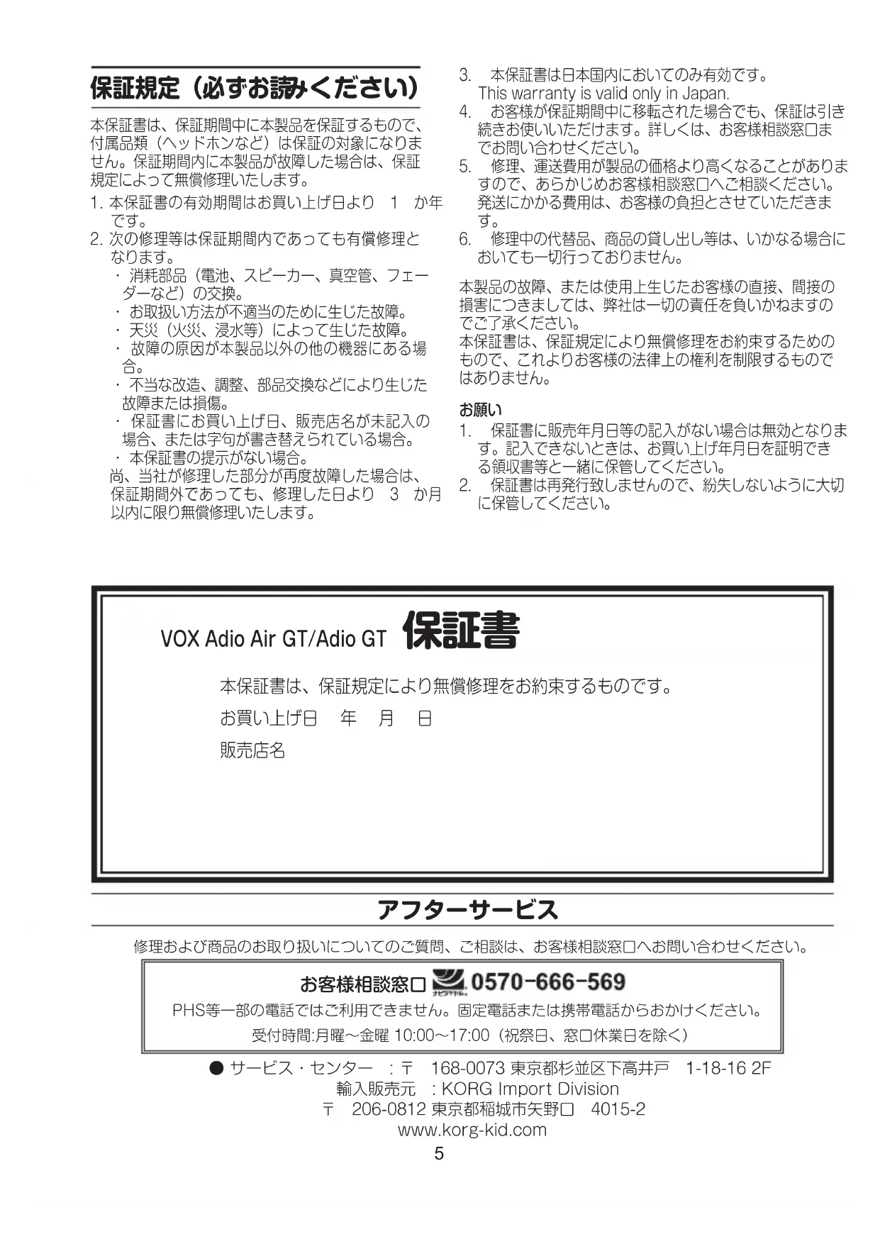 VOX Adio Air GT/Adio GT 本保証書は、保証規定により無償修理をお約束するものです。 お買い上げ日 年 月 日