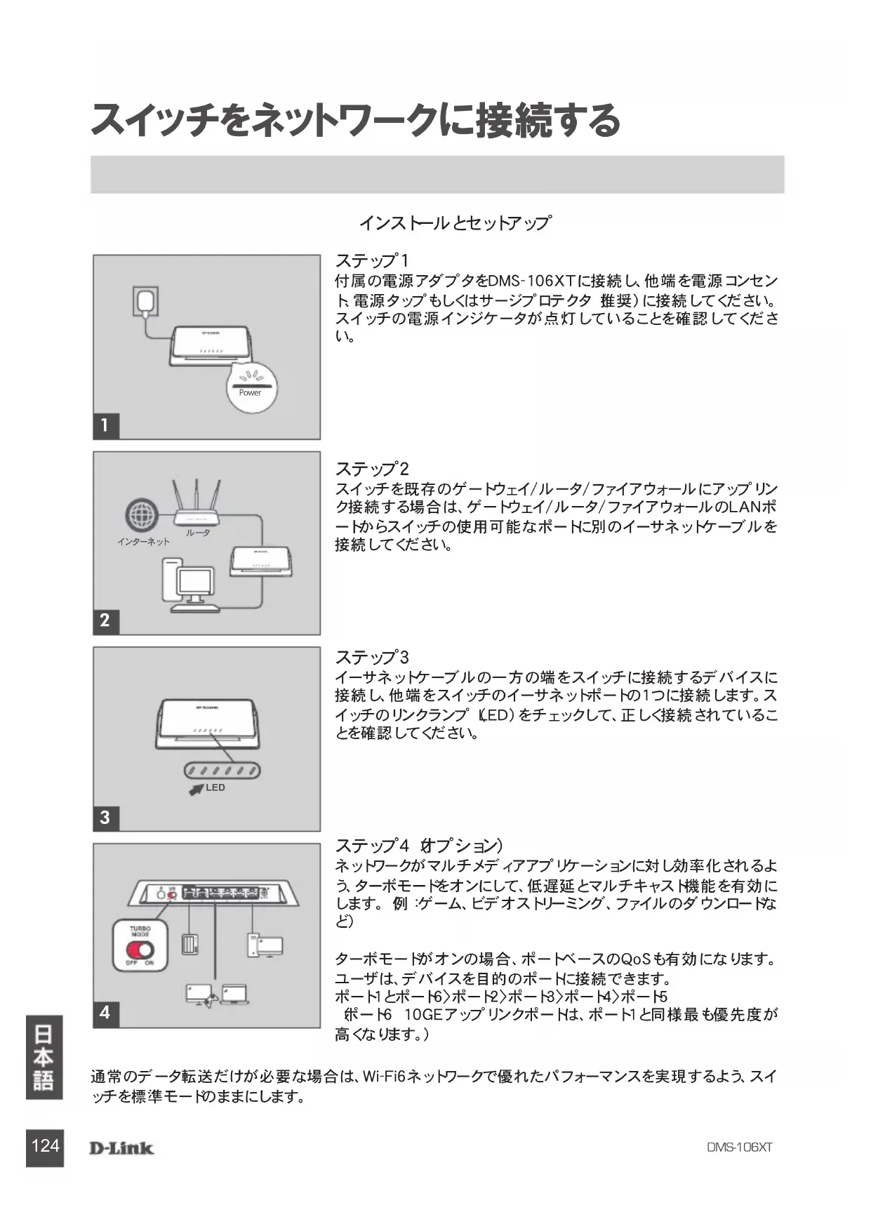 スイッチをネットワークに接続する インストールとセットアップ 通常のデータ転送だけが必要な場合は、Wi-Fi6ネットワークで優れたパフォーマンスを実現するよう、スイ ッチを標準モードのままにします。 ステップ1 付属の電源アダプタをDMS-106XTに接続し、他端を電源コンセン ト、電源タップもしくはサージプロテクタ(推奨)に接続してください。 スイッチの電源インジケータが点灯していることを確認してくださ
