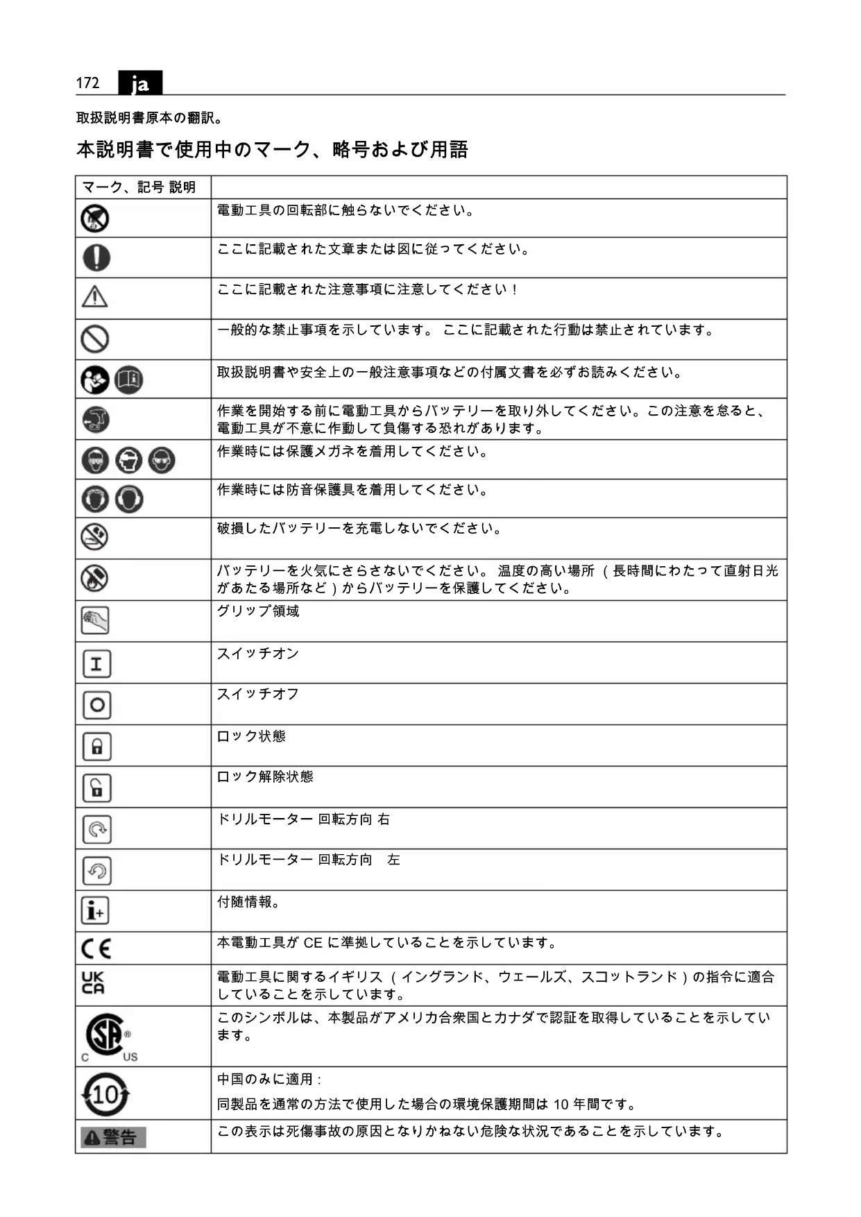 同製品を通常の方法で使用した場合の環境保護期間は 10 年間です。 この表示は死傷事故の原因となりかねない危険な状況であることを示しています。173
