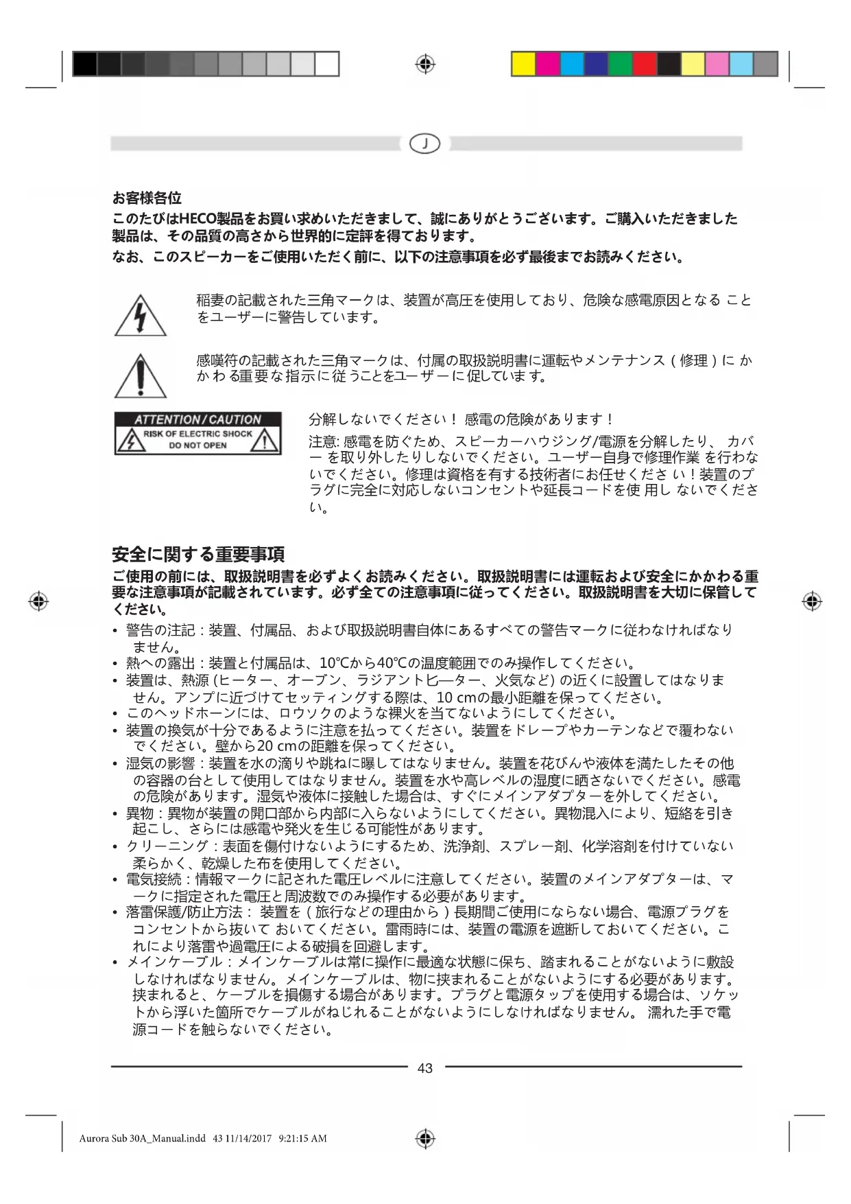 このたびはHECO製品をお買い求めいただきまして、誠にありがとうございます。ご購入いただきました 製品は、その品質の高さから世界的に定評を得ております。 なお、このスピーカーをご使用いただく前に、以下の注意事項を必ず最後までお読みください。 稲妻の記載された三角マークは、装置が高圧を使用しており、危険な感電原因となる こと をユーザーに警告しています。 感嘆符の記載された三角マークは、付属の取扱説明書に運転やメンテナンス(修理)に か か わ る重 要 な 指 示 に 従 うことをユー ザ ー に 促していま す。 分解しないでください! 感電の危険があります! 注意: 感電を防ぐため、スピーカーハウジング/電源を分解したり、 カバ ー を取り外したりしないでください。ユーザー自身で修理作業 を行わな いでください。修理は資格を有する技術者にお任せくださ い!装置のプ ラグに完全に対応しないコンセントや延長コードを使 用し ないでくださ