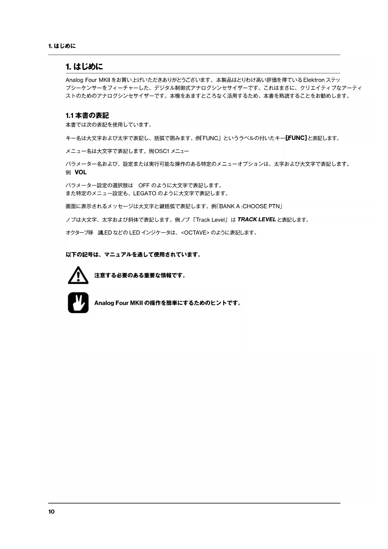 Analog Four MKII をお買い上げいただきありがとうございます。本製品はとりわけ高い評価を得ている Elektron ステッ プシーケンサーをフィーチャーした、デジタル制御式アナログシンセサイザーです。これはまさに、クリエイティブなアーティストのためのアナログシンセサイザーです。本機をあますところなく活用するため、本書を熟読することをお勧めします。
