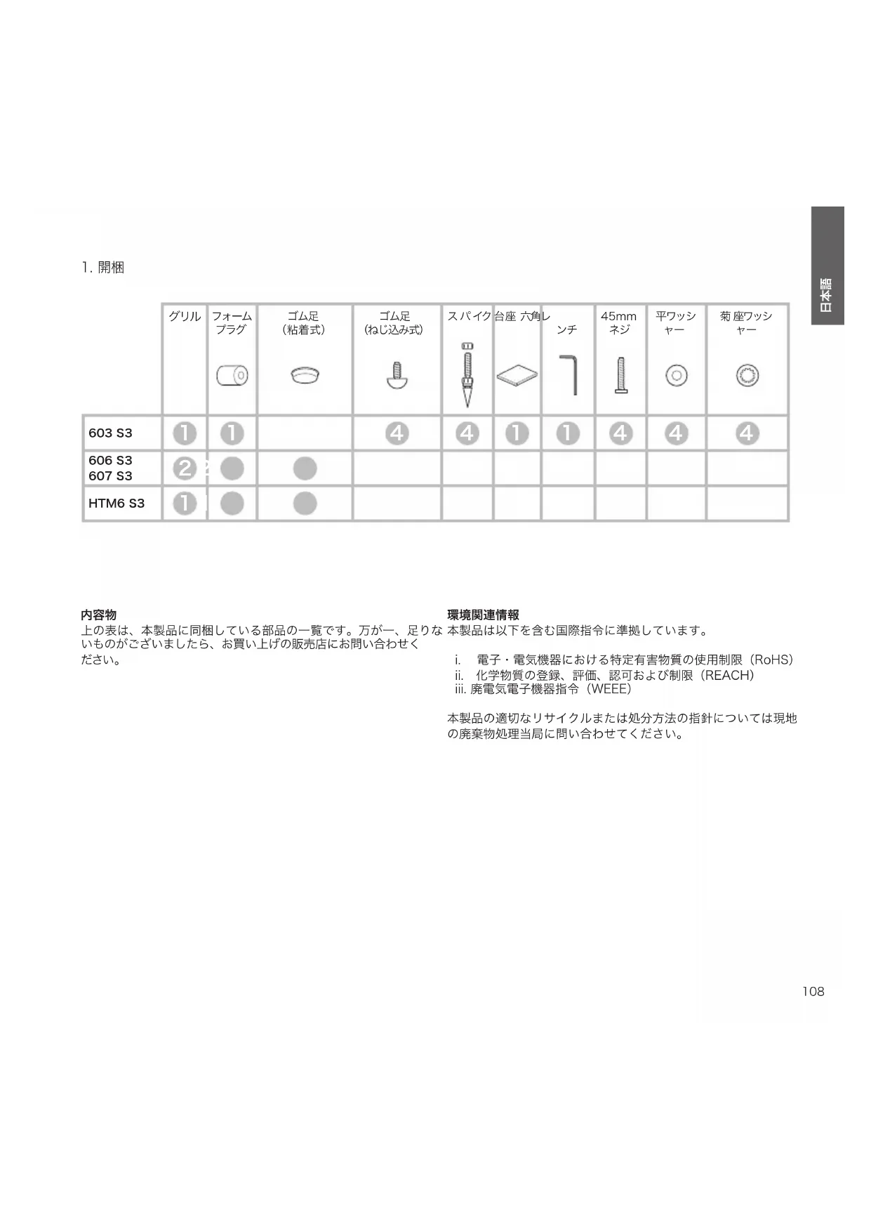 上の表は、本製品に同梱している部品の一覧です。万が一、足りな いものがございましたら、お買い上げの販売店にお問い合わせく