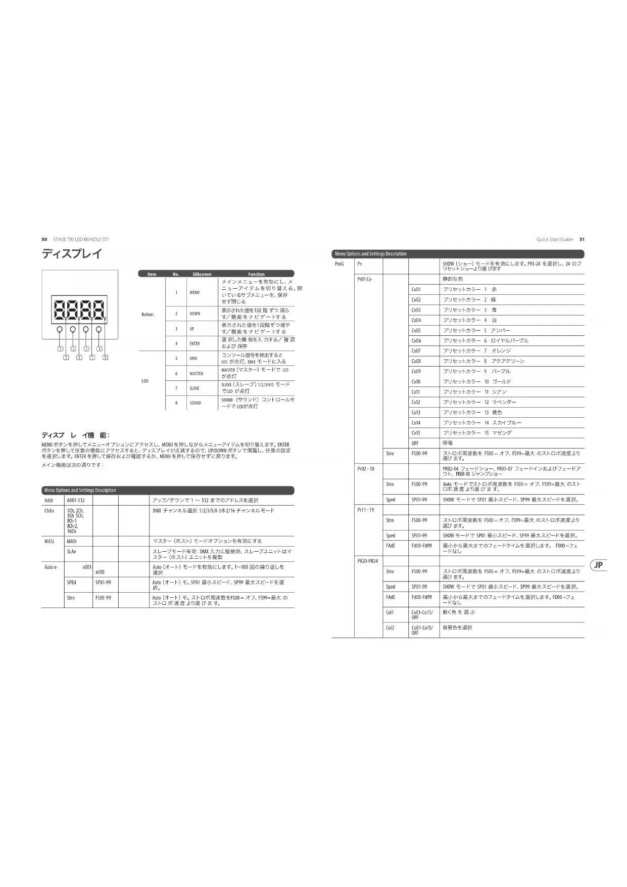 7 SLAVE SLAVE( スレ ーブ )1/2/3/4/5 モード でLED が点灯 8 SOUND SOUND(サウンド)コントロールモ ードで LEDが点灯 ディスプレイ52 53Quick Start GuideSTAGE TRI LED BUNDLE ST1 Menu Options and Settings Description Manu dIM d000-100 マニュアル モードで調光 器 の 輝 度 を0 = オフ、100=最大の間で
