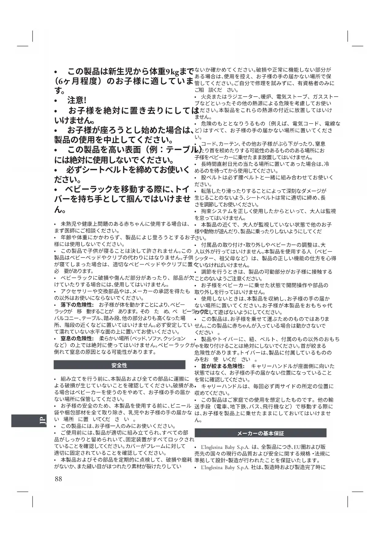 - 注意!危険な状況が発生することが ありますので、お子様を絶対に置き去 りにしてはいけません。本製品をご使 用になる際には、細心の注意を払って ください 。88