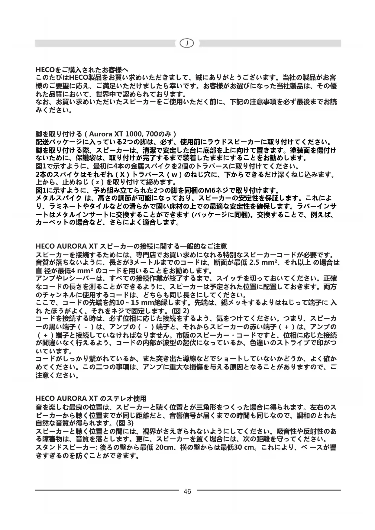 Aurora XT 1000 Aurora XT 700 配置: 3路低音反射 3路低音反射 负荷: 230 / 380瓦 200 / 300瓦 阻抗: 4 – 8 欧 4 – 8 欧 频率范围: 22 – 42 500赫 25 – 42 500赫 最佳放大功率: 30 – 380瓦 30 – 300瓦 有效系数 (2.8V/1m): 93 分贝 92 分贝 尺寸 (宽x高x长): 305 x 1258 x 393毫米 265 x 1158 x 343毫米 附件: 金属销钉 金属销钉 硬橡胶销钉 硬橡胶销钉 Aurora XT 300 Aurora XT CENTER 30 配置: 2路低音反射 2路低音反射 负荷: 80 / 150瓦 90 / 150瓦 阻抗: 4 – 8 欧 4 – 8 欧 频率范围: 32 – 42 500赫 34– 42 500赫 最佳放大功率: 20 – 150瓦 20 – 150 瓦 有效系数 (2.8V/1m): 90 分贝 90 分贝 尺寸 (宽x高x长): 195 x 357 x 333毫米 490 x 177 x 303毫米 附件: 硬橡胶销钉 硬橡胶销钉 硬橡胶销钉46 HECOをご購入されたお客様へ このたびはHECO製品をお買い求めいただきまして、誠にありがとうございます。当社の製品がお客 様のご要望に応え、ご満足いただけましたら幸いです。お客様がお選びになった当社製品は、その優 れた品質において、世界中で認められております。 なお、お買い求めいただいたスピーカーをご使用いただく前に、下記の注意事項を必ず最後までお読