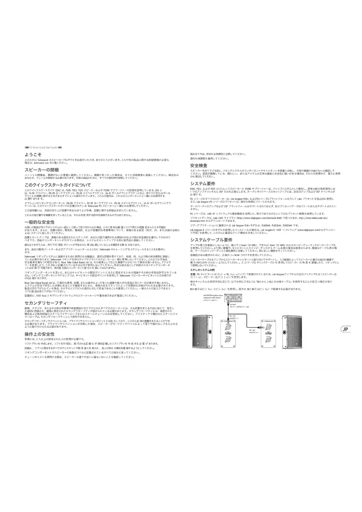ユニットの開梱後、損傷がないか慎重に確認してください。損傷が見つかった場合は、すぐに供給業者に連絡してください。輸送先の あなたが、クレームを開始する必要があります。将来の返品のために、すべての梱包材を保管してください。 このクイックスタートガイドについて このクイックスタートガイド(QSG)は 、PQ10、PQ12、PQ15 スピーカーおよび PQ18B サ ブ ウ ーフ ァ ー の 詳 細 を 説 明 して い ま す。QSG に は、TQ-FB フライバー 、PQ-YB ヨー クブラケット、PQ-SB スイベルブラケット、SA-35 ポールマウントブラケットなど、吊り下げまたはポール マウントの準備に関するさまざまなオプションも表示されています。これらの指示は、これらのコンポーネントと一緒にのみ使用する 必 要が ありま す。 オプションのリギングコンポーネント(TQ-FB フライバー、PQ-YB ヨー クブラ ケット、PQ-SB スイベ ルブラ ケット、SA-35 ポ ー ル マ ウ ントブ ラ ケット)は、このクイックスタートガイドに記載されている Turbosound PQ スピーカーと一緒にのみ使用してください。 この説明書には、外部の吊り上げ装置や安全な吊り上げ手順、設置に関する詳細は含まれていません。 これらの指示書や手順書を持っていることは、それらを使 用する許可を意味するものではありません。