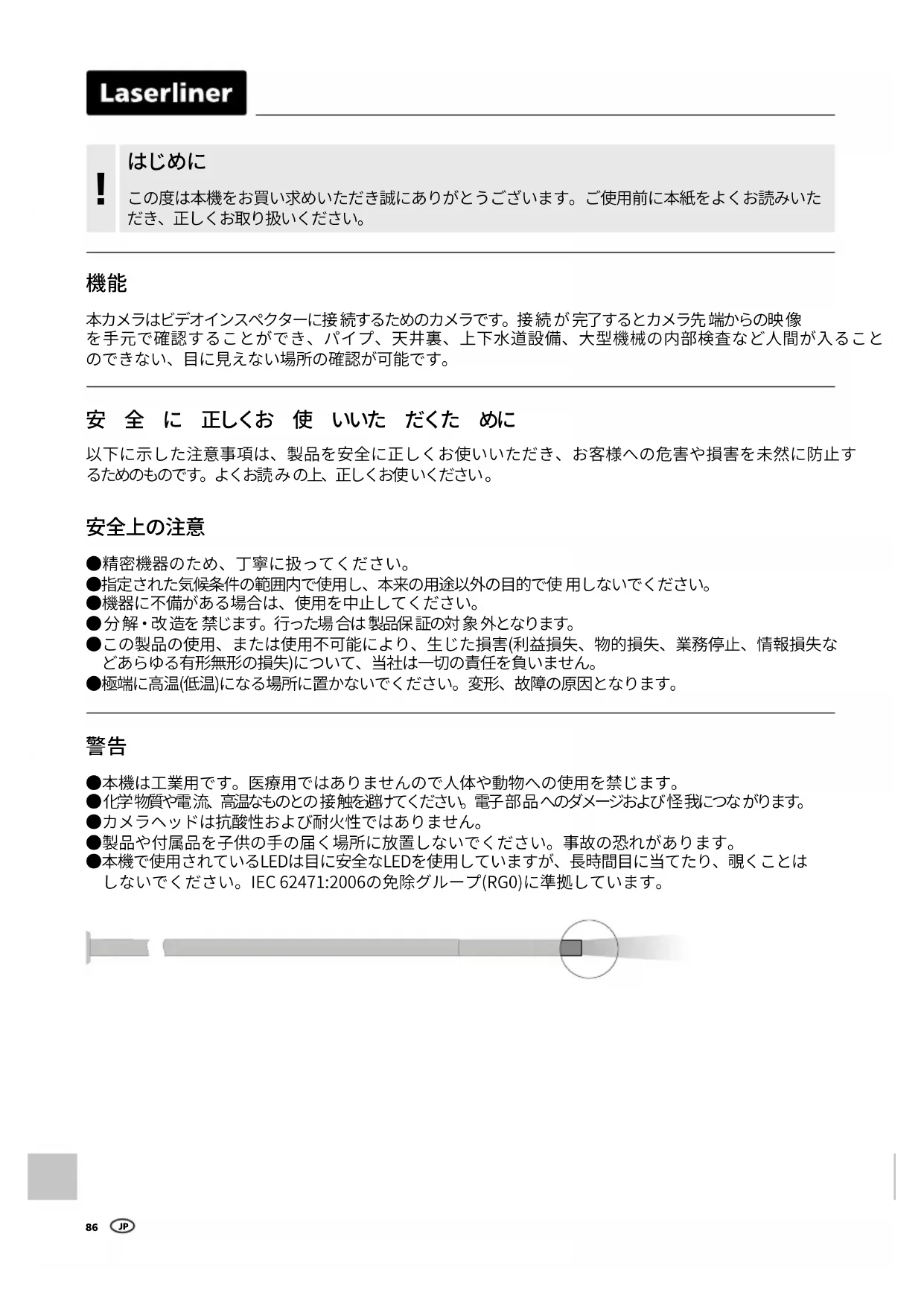 ●本機は工業用です。医療用ではありませんので人体や動物への使用を禁じます。 ● 化学 物質や電 流、高温なものとの 接 触を避けてください。電子 部 品 へのダメージおよび 怪 我につな がります。 ●カメラヘッドは抗酸性および耐火性ではありません。 ●製品や付属品を子供の手の届く場所に放置しないでください。事故の恐れがあります。 ●本機で使用されているLEDは目に安全なLEDを使用していますが、長時間目に当てたり、覗くことは しないでください。IEC 62471:2006の免除グループ(RG0)に準拠しています。