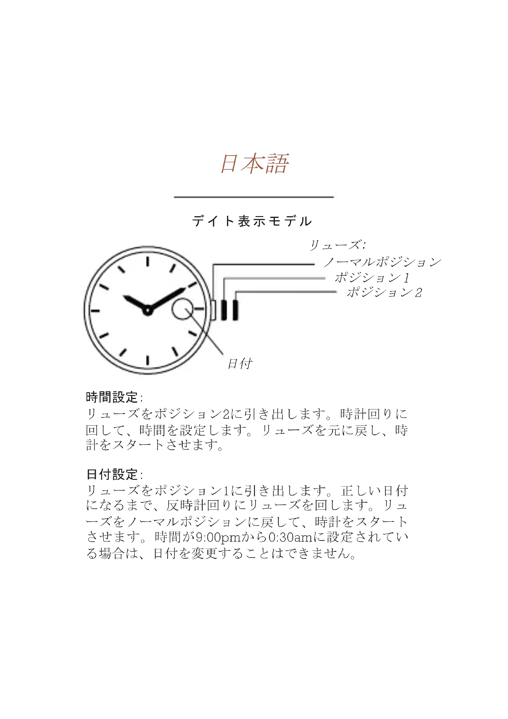 リューズをポジション1に引き出します。正しい日付になるまで、 反時計回りにリューズを回します。リューズをノーマルポジショ ンに戻し、時計をスタートさせます。時間が9:00pmから0:30amに 設定されている場合は、日付を変更することはできません。