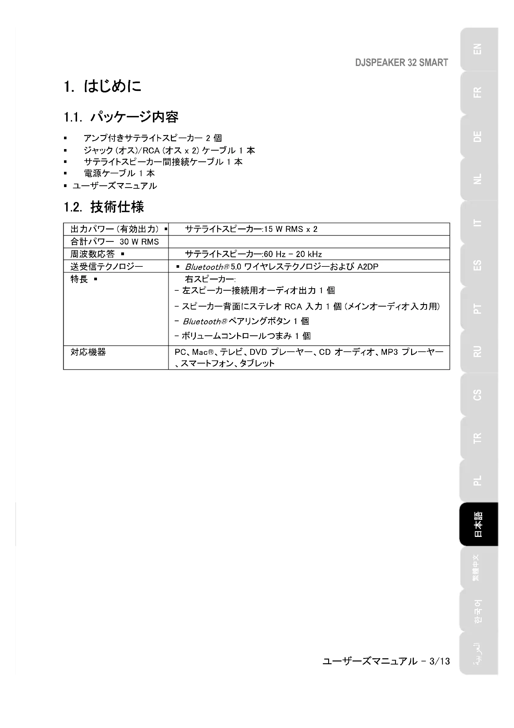 Bluetooth® ペアリングボタン 1 個 - ボリュームコントロールつまみ 1 個 対応機器 PC、Mac®、テレビ、DVD プレーヤー、CD オーディオ、MP3 プレーヤー 、スマートフォン、タブレットDJSPEAKER 32 SMART 4/13 – ユーザーズマニュアル 1.3. 推奨事項 - 落下を防ぐため、サテライトスピーカーは平らな場所に置いてください。 - 内部の部品の破損を防ぐため、スピーカーキットを開けないでください。 - このスピーカーキットは、温暖な環境での使用を想定して設計されています。 - 火災や放電の危険を防ぐため、スピーカーキットを次の場所に近づけないでください: - 雨または湿度、およびその他の液体 (水、化学薬品など)、 - ヒーター、ストーブ、その他の発熱器具 (アンプを含む) などの熱源、