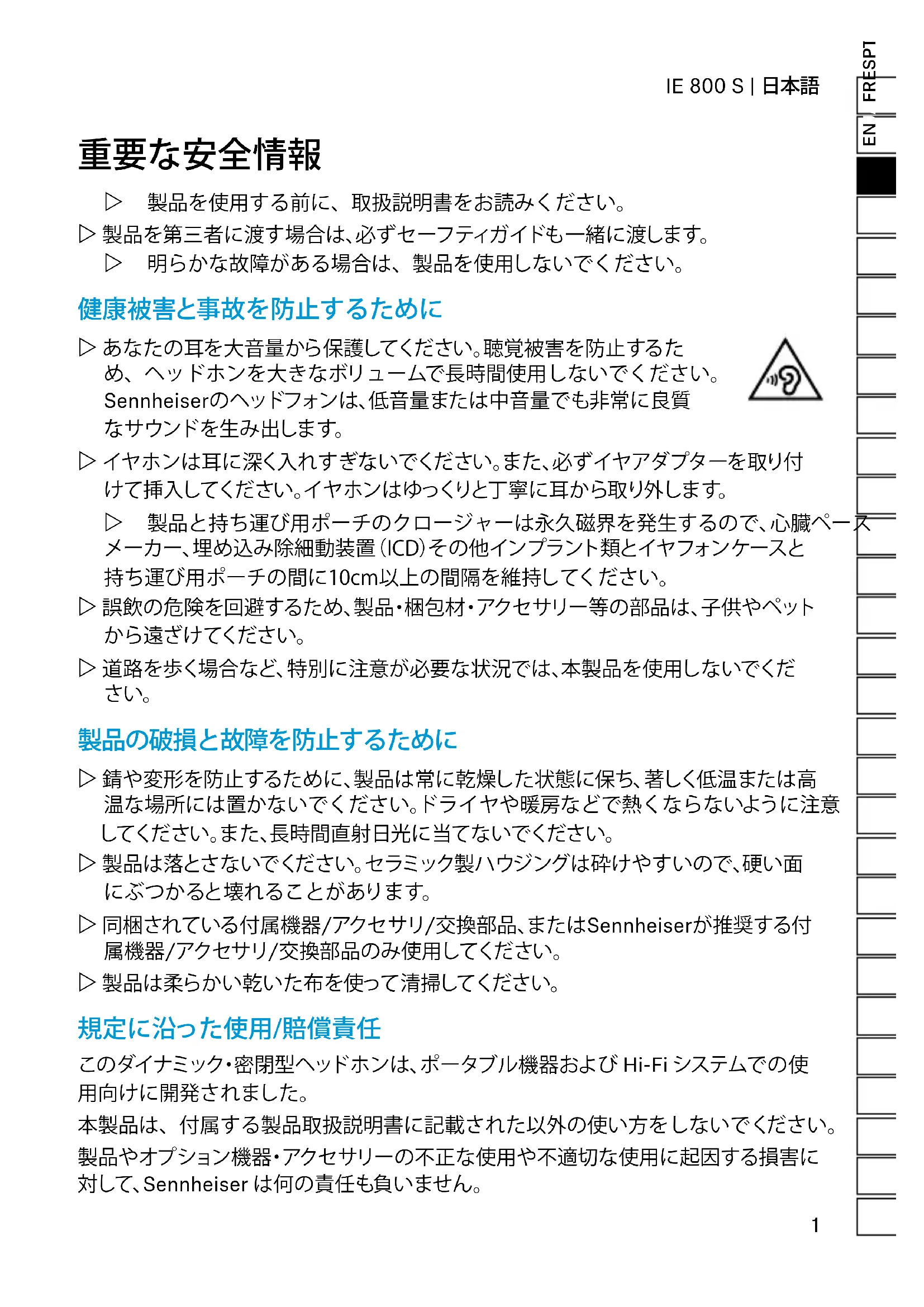 Z 製品を使用する前に、取扱説明書をお読みください。 Z 製品を第三者に渡す場合は、必ずセーフティガイドも一緒に渡します。 Z 明らかな故障がある場合は、製品を使用しないでください。 健康被害と事故を防止するために Z あなたの耳を大音量から保護してください。聴覚被害を防止するた め、ヘッドホンを大きなボリュームで長時間使用しないでください。 Sennheiserのヘッドフォンは、低音量または中音量でも非常に良質 なサウンドを生み出します。 Z イヤホンは耳に深く入れすぎないでください。また、必ずイヤアダプターを取り付 けて挿入してください。イヤホンはゆっくりと丁寧に耳から取り外します。 Z 製品と持ち運び用ポーチのクロージャーは永久磁界を発生するので、心臓ペース メーカー、埋め込み除細動装置(ICD)その他インプラント類とイヤフォンケースと 持ち運び用ポーチの間に10cm以上の間隔を維持してください。 Z 誤飲の危険を回避するため、製品・梱包材・アクセサリー等の部品は、子供やペット から遠ざけてください。 Z 道路を歩く場合など、特別に注意が必要な状況では、本製品を使用しないでくだ