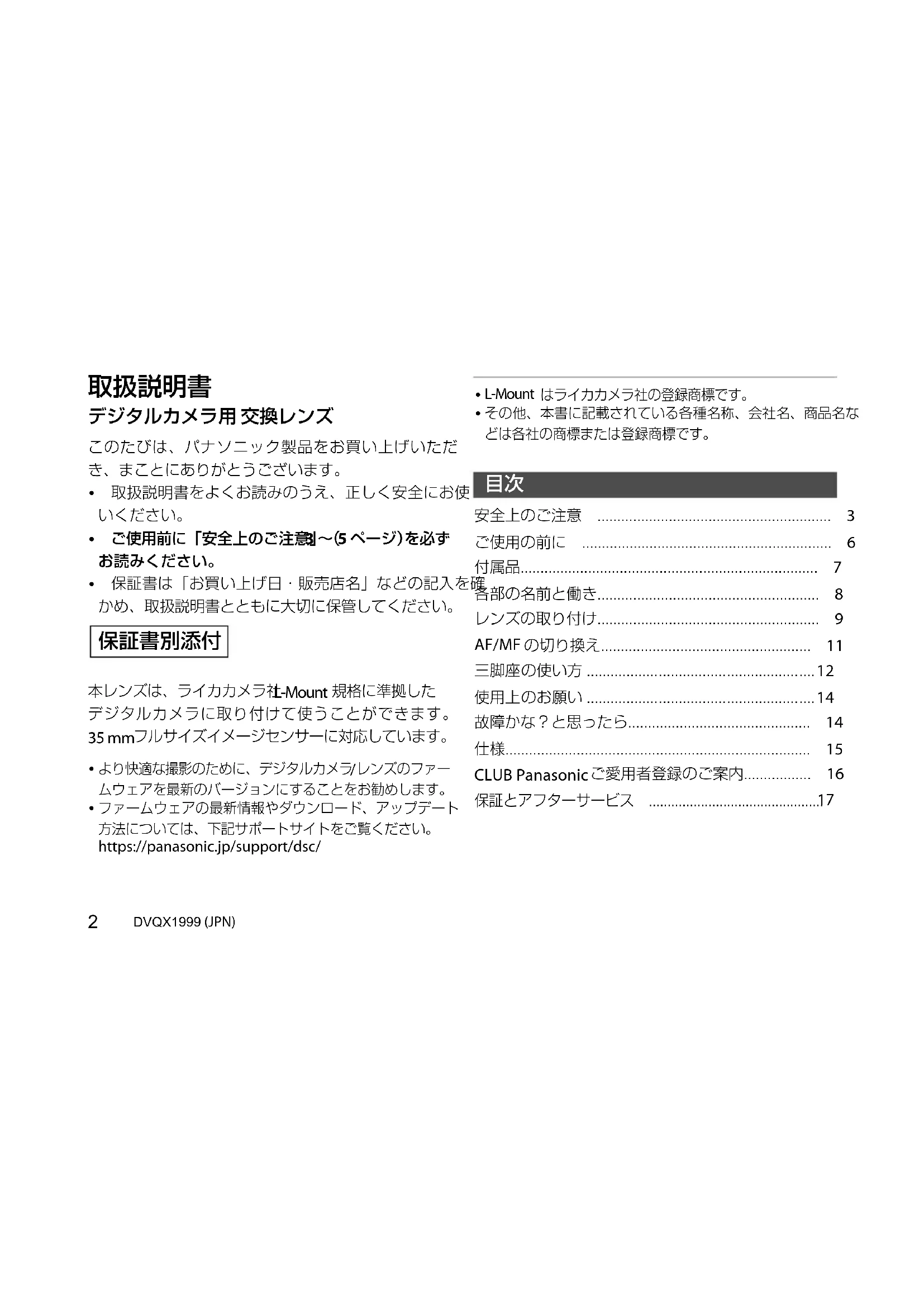 デジタルカメラ用 交換レンズ このたびは、パナソニック製品をお買い上げいただき、まことにありがとうございます。0 取扱説明書をよくお読みのうえ、正しく安全にお使いください。0 ご使用前に「安全上のご注意」( 3 〜 5 ページ)を必ず お読みください。0 保証書は「お買い上げ日・販売店名」などの記入を確かめ、取扱説明書とともに大切に保管してください。本レンズは、ライカカメラ社 L-Mount 規格に準拠したデジタルカメラに取り付けて使うことができます。 35 mm フルサイズイメージセンサーに対応しています。 より快適な撮影のために、デジタルカメラ レンズのファームウェアを最新のバージョンにすることをお勧めします。 ファームウェアの最新情報やダウンロード、アップデート方法については、下記サポートサイトをご覧ください。https://panasonic.jp/support/dsc/ L-Mountはライカカメラ社の登録商標です。 その他、本書に記載されている各種名称、会社名、商品名などは各社の商標または登録商標です。安全上のご注意 ........................................................... 3ご使用の前に ............................................................... 6付属品........................................................................... 7各部の名前と働き........................................................ 8レンズの取り付け........................................................ 9 AF/MF の切り換え..................................................... 11 三脚座の使い方 ......................................................... 12 使用上のお願い ......................................................... 14 故障かな?と思ったら.............................................. 14仕様............................................................................. 15 CLUB Panasonic ご愛用者登録のご案内................. 16保証とアフターサービス ...............................................