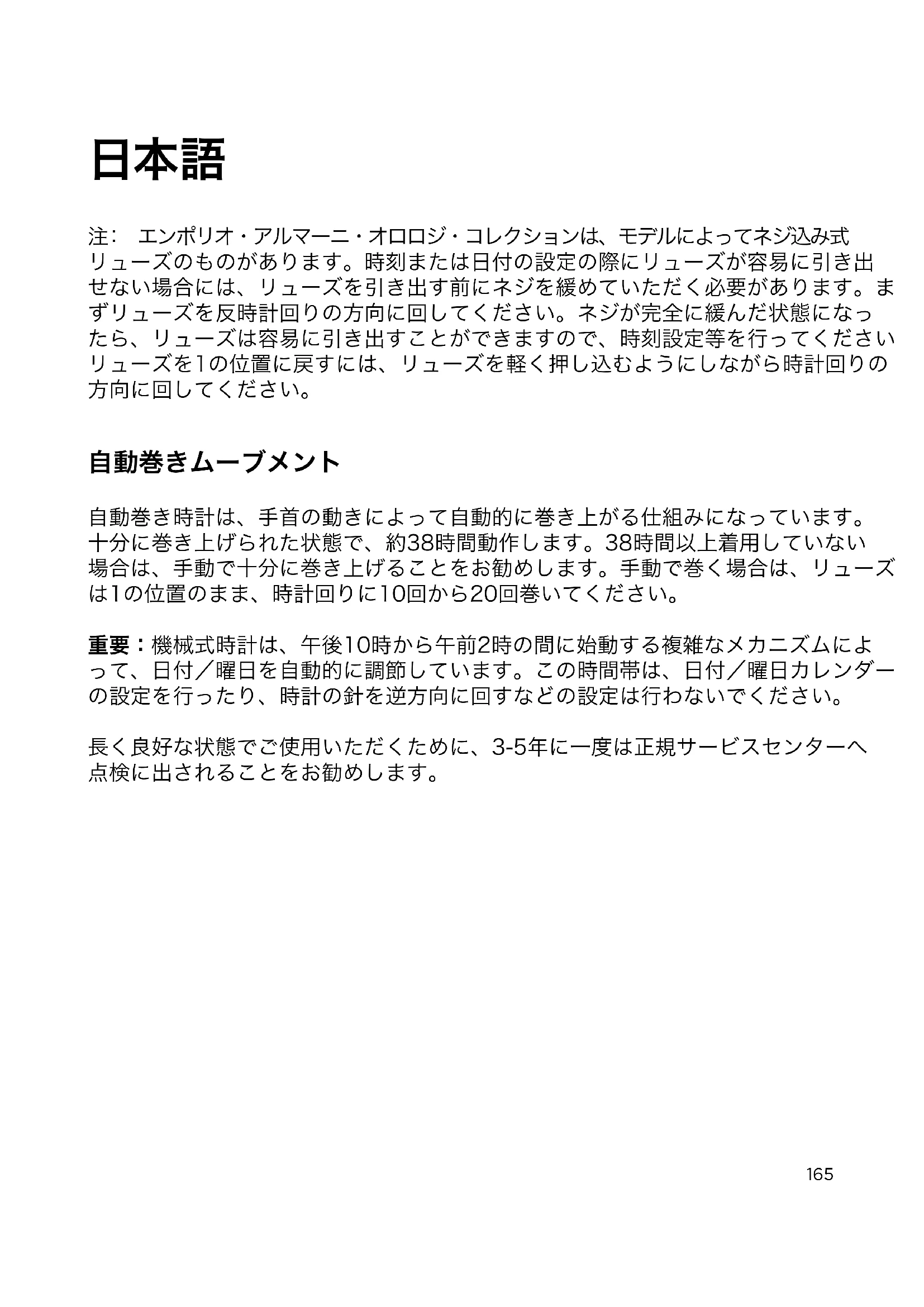 自動巻き時計は、手首の動きによって自動的に巻き上がる仕組みになっています。 十分に巻き上げられた状態で、約38時間動作します。38時間以上着用していない 場合は、手動で十分に巻き上げることをお勧めします。手動で巻く場合は、リューズ は1の位置のまま、時計回りに10回から20回巻いてください。 重要:機械式時計は、午後10時から午前2時の間に始動する複雑なメカニズムによ って、日付/曜日を自動的に調節しています。この時間帯は、日付/曜日カレンダー の設定を行ったり、時計の針を逆方向に回すなどの設定は行わないでください。 長く良好な状態でご使用いただくために、3-5年に一度は正規サービスセンターへ 点検に出されることをお勧めします。 JAPANESE166