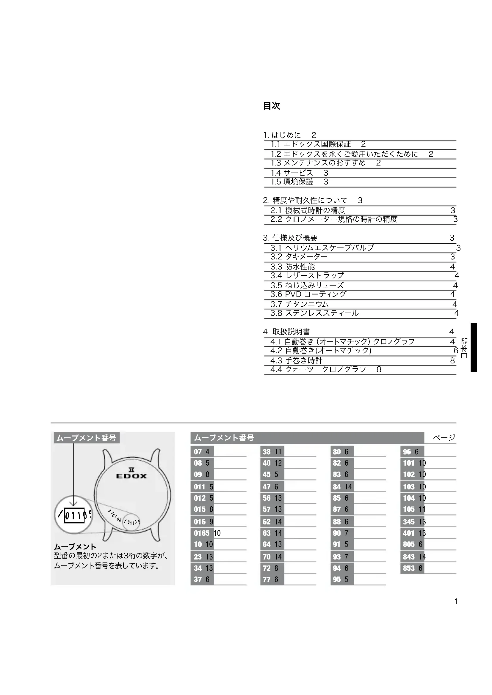 ムーブメント番号07 408 509 8011 5012 5015 8016 90165 1010 1023 1334 1337 638 1140 1245 547 656 1357 1362 1463 1464 1370 1472 877 680 682 683 684 1485 687 688 690 791 593 794 695 596 6101 10102 10103 10104 10105 11345 13401 13805 6843 14853 61.はじめに 21.1エドックス国際保証 21.2エドックスを永くご愛用いただくために 21.3メンテナンスのおすすめ 21.4サービス 31.5環境保護 32.精度や耐久性について 32.1機械式時計の精度 32.2クロノメーター規格の時計の精度 33.仕様及び概要 33.1ヘリウムエスケープバルブ 33.2タキメーター 33.3防水性能 43.4レザーストラップ 43.5ねじ込みリューズ 4 3.6PVDコーティング 4 3.7チタンニウム 43.8ステンレススティール 44.取扱説明書 4 4.1自動巻き(オートマチック)クロノグラフ 4 4.2自動巻き(オートマチック) 64.3手巻き時計 84.4クォーツ クロノグラフ 8 ムーブメント番号 ページ2