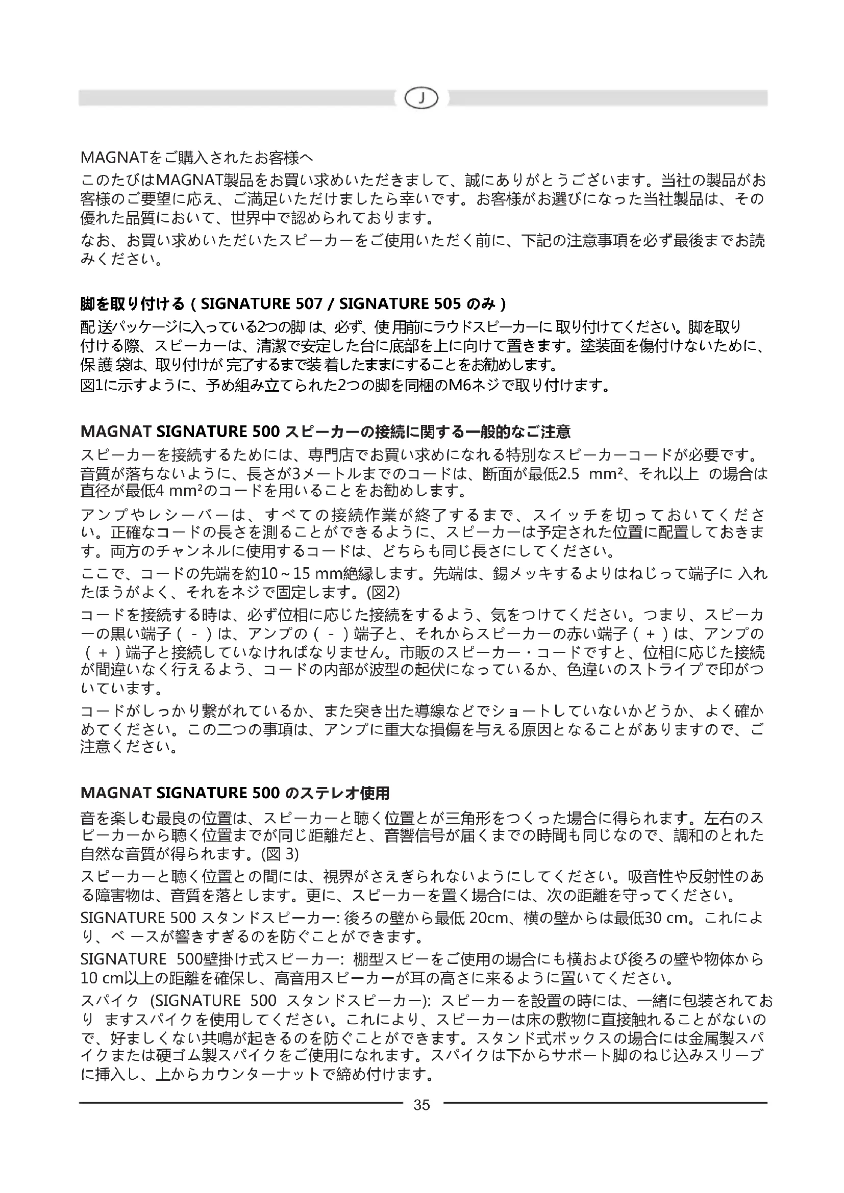 34MAGNATをご購入されたお客様へ このたびはMAGNAT製品をお買い求めいただきまして、誠にありがとうございます。当社の製品がお 客様のご要望に応え、ご満足いただけましたら幸いです。お客様がお選びになった当社製品は、その 優れた品質において、世界中で認められております。 なお、お買い求めいただいたスピーカーをご使用いただく前に、下記の注意事項を必ず最後までお読