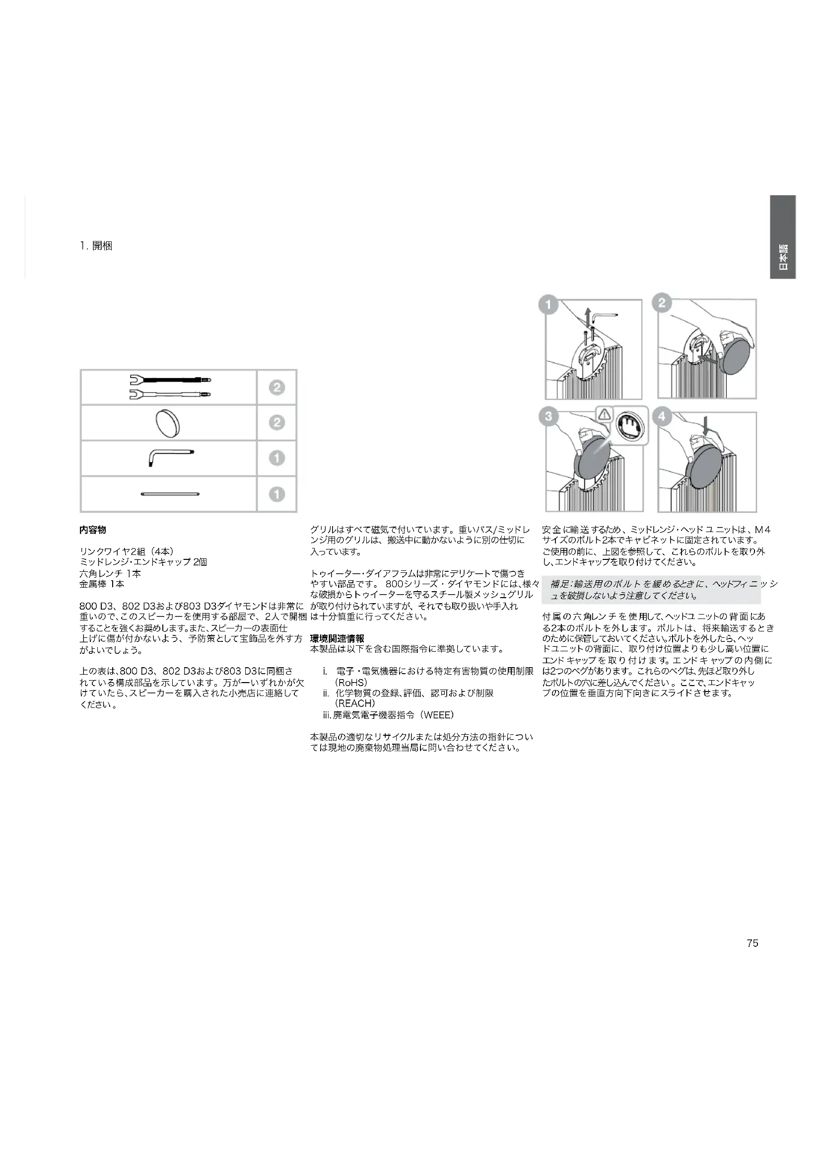 リンクワイヤ2組(4本) ミッドレンジ・エンドキャップ 2個 六角レンチ 1本 金属棒 1本 800 D3、802 D3および803 D3ダイヤモンドは非常に 重いので、このスピーカーを使用する部屋で、2人で開梱 することを強くお奨めします。また、スピーカーの表面仕 上げに傷が付かないよう、予防策として宝飾品を外す方