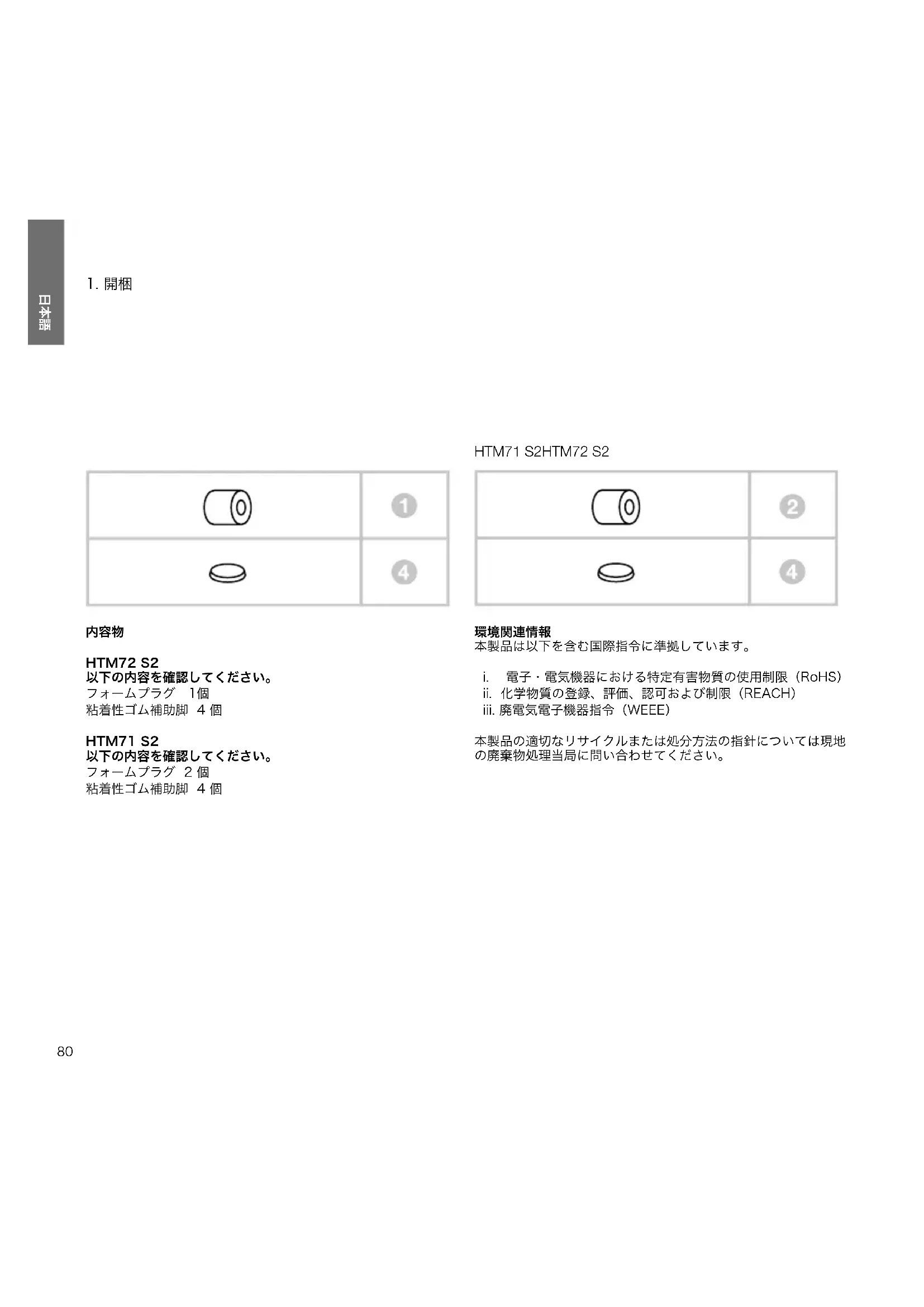 HTM72 S2 以下の内容を確認してください。 フォームプラグ 1個 粘着性ゴム補助脚 4 個 HTM71 S2 以下の内容を確認してください。 フォームプラグ 2 個 粘着性ゴム補助脚 4 個