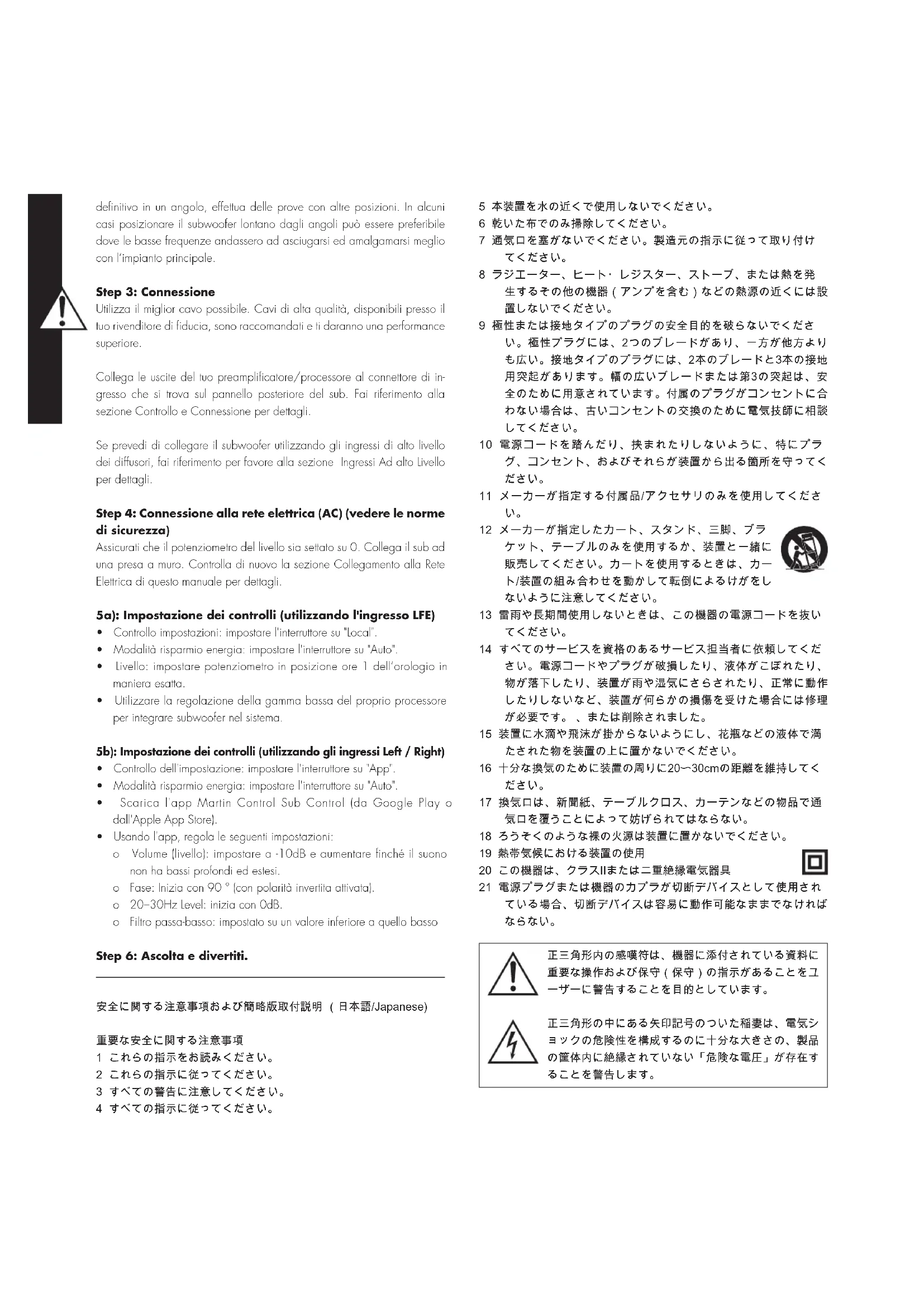 - Usando l'app, regola le seguenti impostazioni: o Volume (livello): impostare a -10dB e aumentare finché il suono non ha bassi profondi ed estesi. o Fase: Inizia con 90 ° (con polarità invertita attivata). o 20–30Hz Level: inizia con 0dB. o Filtro passa-basso: impostato su un valore inferiore a quello basso Step 6: Ascolta e divertiti. 安全に関する注意事項および簡略版取付説明 (日本語/Japanese) 重要な安全に関する注意事項 1 これらの指示をお読みください。 2 これらの指示に従ってください。 3 すべての警告に注意してください。 4 すべての指示に従ってください。 5 本装置を水の近くで使用しないでください。 6 乾いた布でのみ掃除してください。 7 通気口を塞がないでください。製造元の指示に従って取り付け