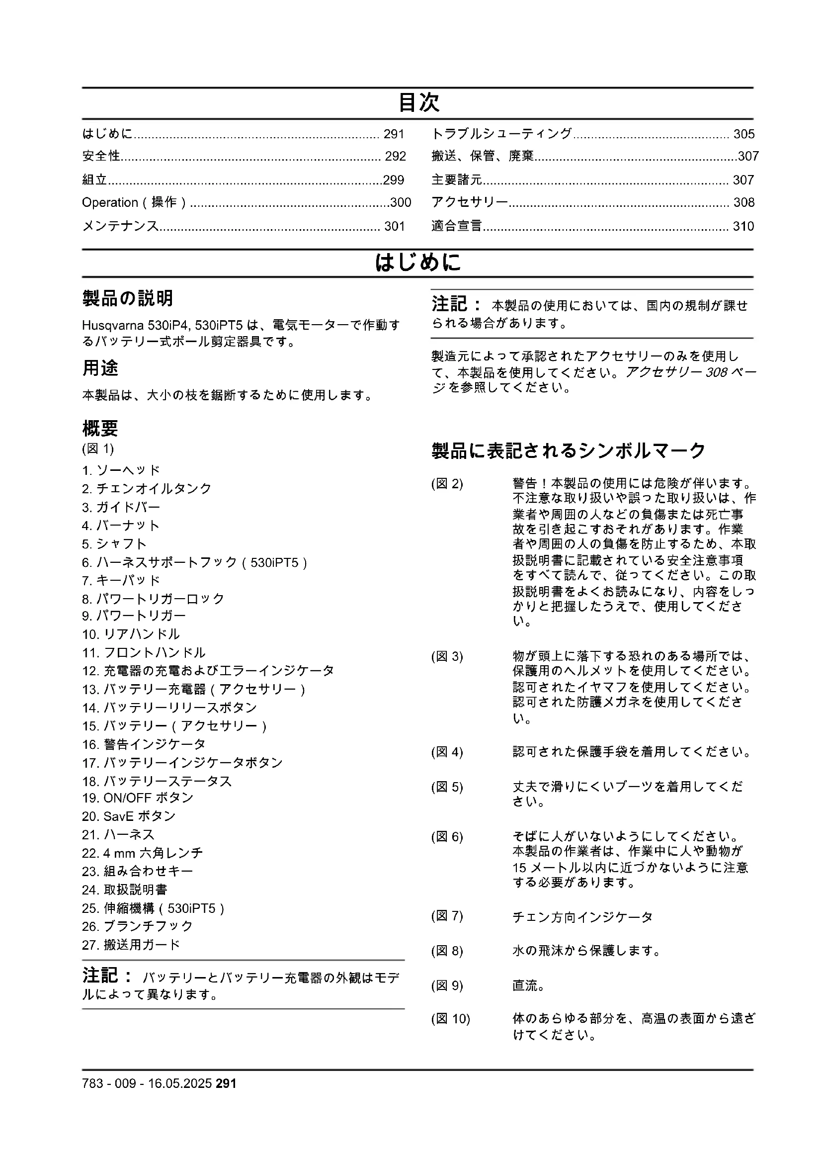 Husqvarna 530iP4, 530iPT5 は、電気モーターで作動す るバッテリー式ポール剪定器具です。