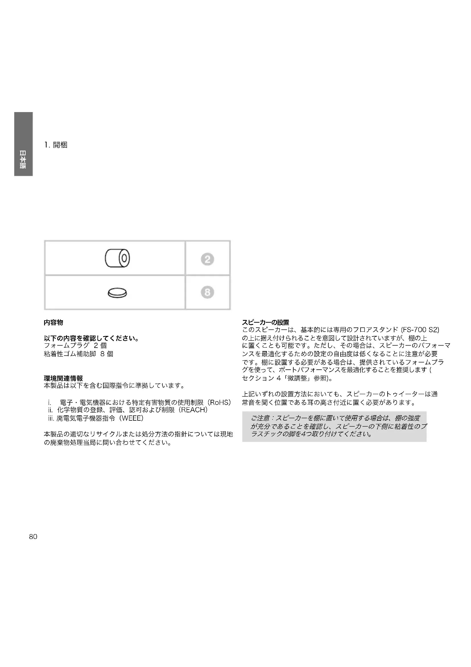 このスピーカーは、基本的には専用のフロアスタンド (FS-700 S2) の上に据え付けられることを意図して設計されていますが、棚の上 に置くことも可能です。ただし、その場合は、スピーカーのパフォーマ ンスを最適化するための設定の自由度は低くなることに注意が必要 です。棚に設置する必要がある場合は、提供されているフォームプラ グを使って、ポートパフォーマンスを最適化することを推奨します ( セクション 4「微調整」参照)。 上記いずれの設置方法においても、スピーカーのトゥイーターは通 常音を聞く位置である耳の高さ付近に置く必要があります。 ご注意:スピーカーを棚に置いて使用する場合は、棚の強度 が充分であることを確認し、スピーカーの下側に粘着性のプ ラスチックの脚を4つ取り付けてください。 日本語81