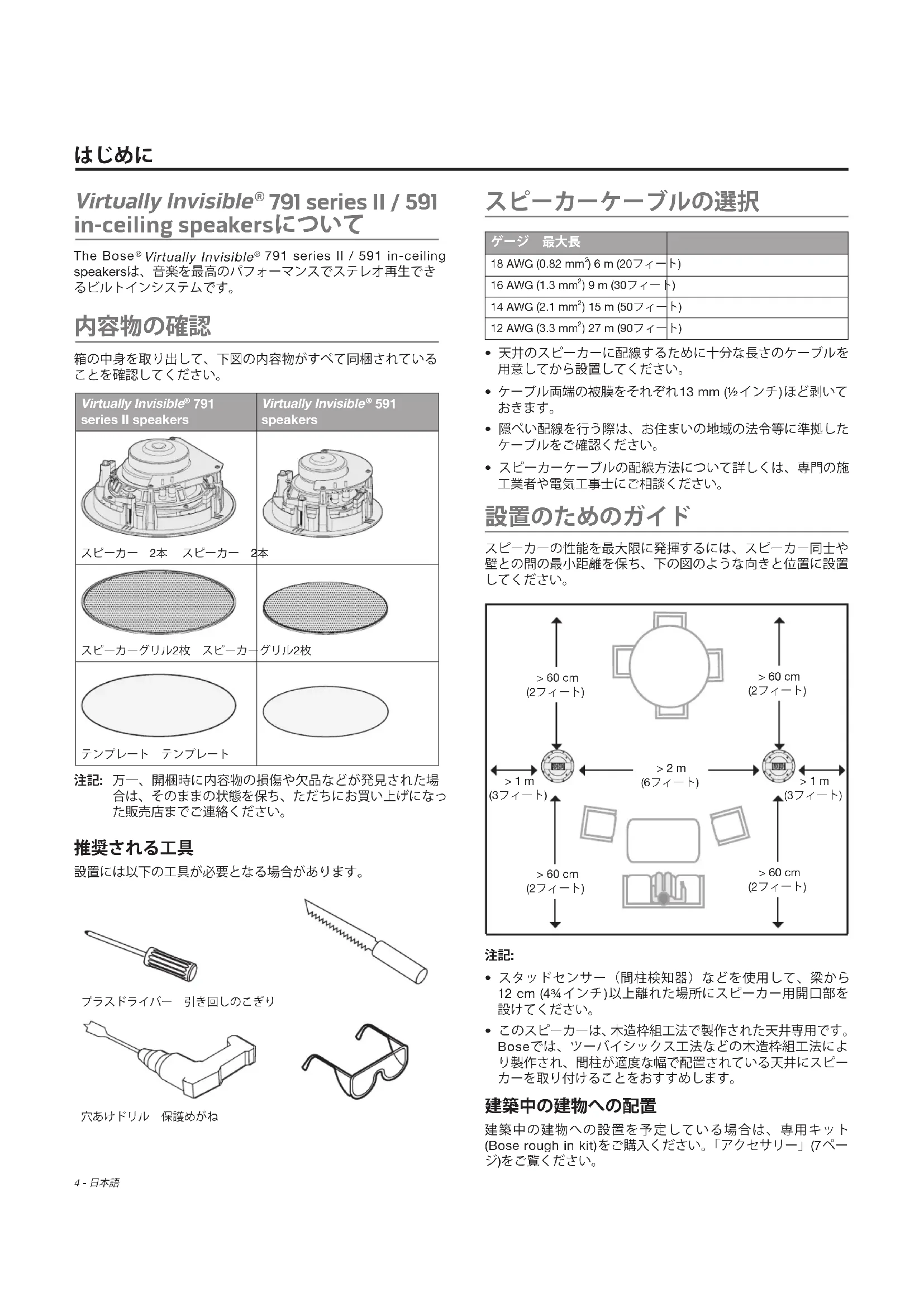 591 speakersスピーカー 2本 スピーカー 2本スピーカーグリル2枚 スピーカーグリル2枚テンプレート テンプレート注記: 万一、開梱時に内容物の損傷や欠品などが発見された場合は、そのままの状態を保ち、ただちにお買い上げになった販売店までご連絡ください。 設置には以下の工具が必要となる場合があります。プラスドライバー 引き回しのこぎり穴あけドリル 保護めがね スピーカーケーブルの選択 ゲージ 最大長18 AWG (0.82 mm ) 6 m (20フィート)16 AWG (1.3 mm ) 9 m (30フィート)14 AWG (2.1 mm ) 15 m (50フィート)12 AWG (3.3 mm ) 27 m (90フィート)• 天井のスピーカーに配線するために十分な長さのケーブルを用意してから設置してください。
