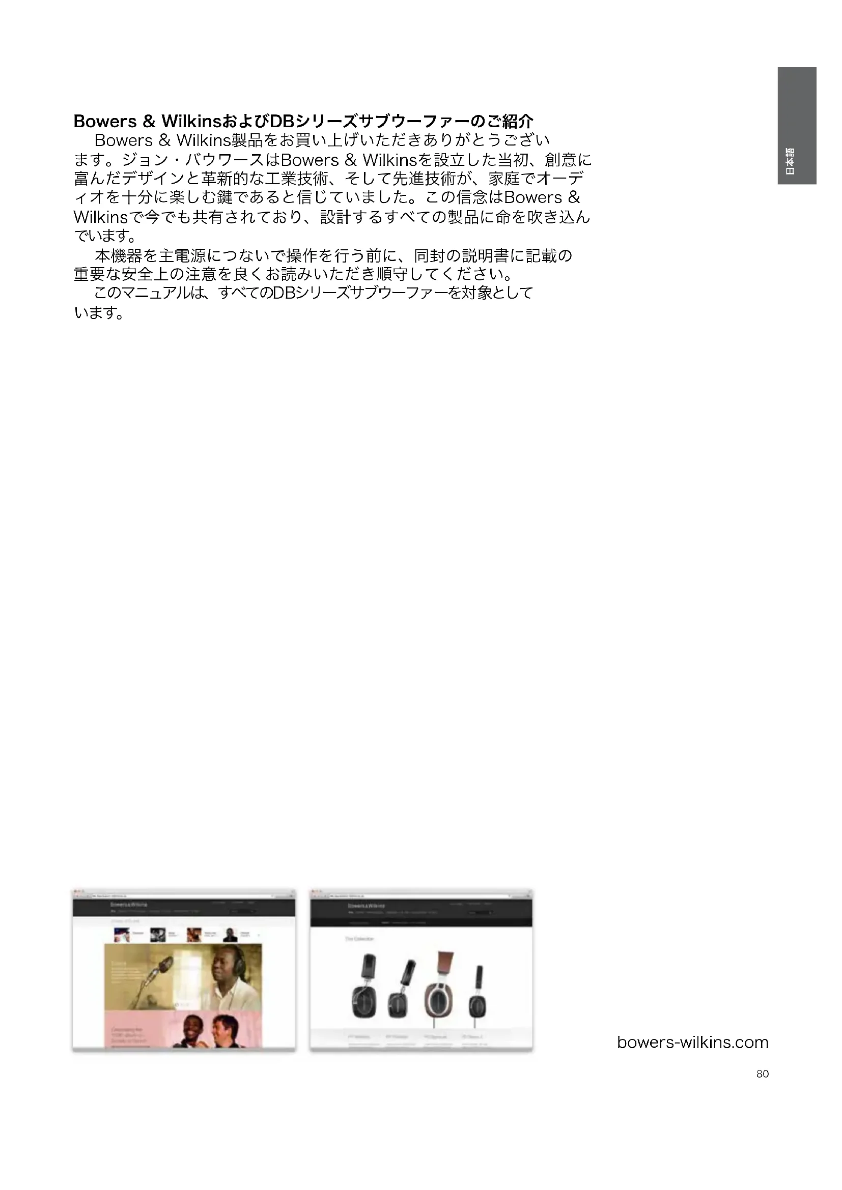 bowers-wilkins.com Bowers & WilkinsおよびDBシリーズサブウーファーのご紹介 Bowers&Wilkins製品をお買い上げいただきありがとうござい ます。ジョン・バウワースはBowers&Wilkinsを設立した当初、創意に 富んだデザインと革新的な工業技術、そして先進技術が、家庭でオーデ ィオを十分に楽しむ鍵であると信じていました。この信念はBowers& Wilkinsで今でも共有されており、設計するすべての製品に命を吹き込ん