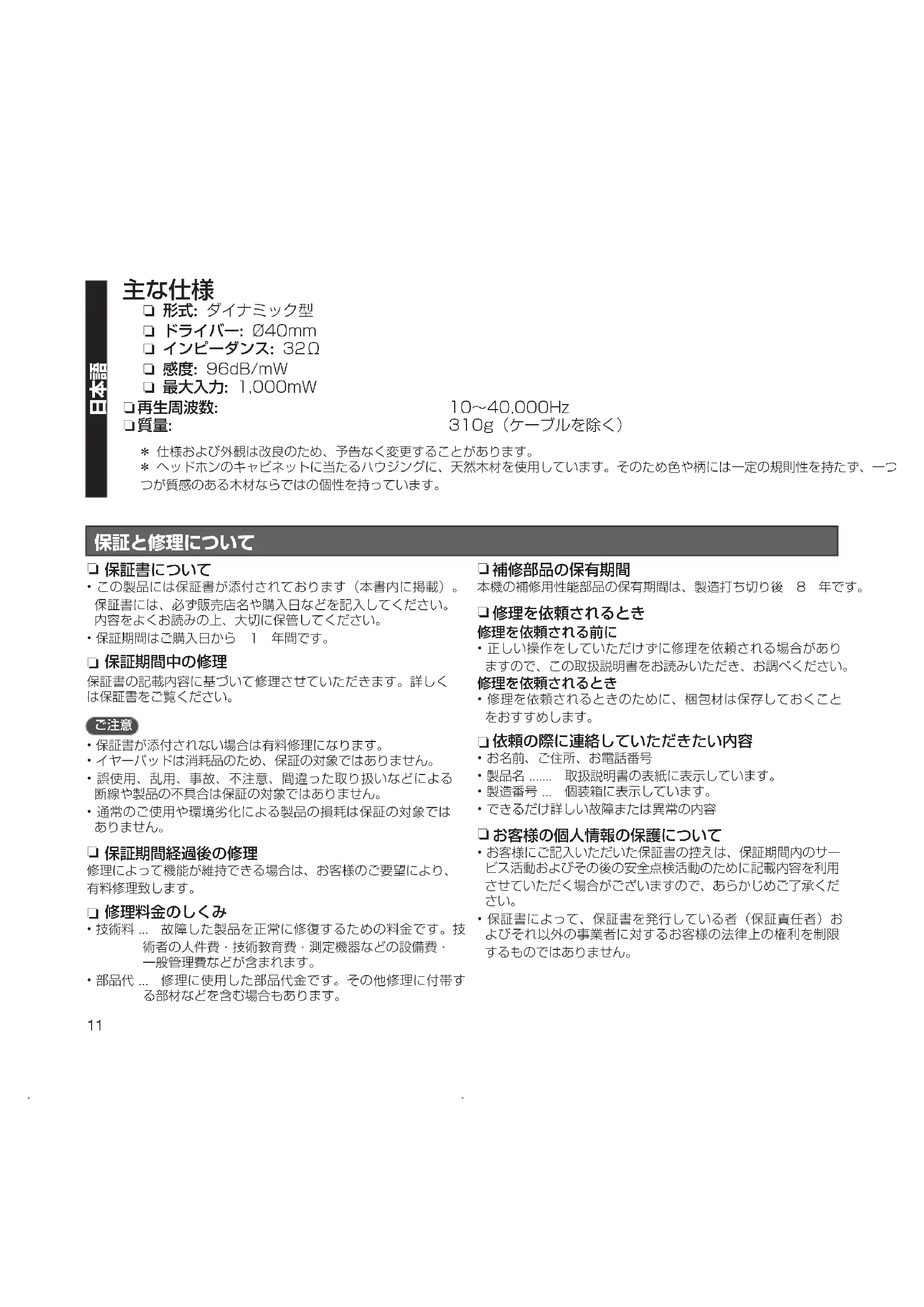 n 形式: ダイナミック型 n ドライバー: Ø40mm n インピーダンス: 32Ω n 感度: 96dB/mW n 最大入力: 1,000mW n 再生周波数: 10~40,000Hz n 質量: 310g(ケーブルを除く) z 仕様および外観は改良のため、予告なく変更することがあります。 z ヘッドホンのキャビネットに当たるハウジングに、天然木材を使用しています。そのため色や柄には一定の規則性を持たず、一つ一 つが質感のある木材ならではの個性を持っています。
