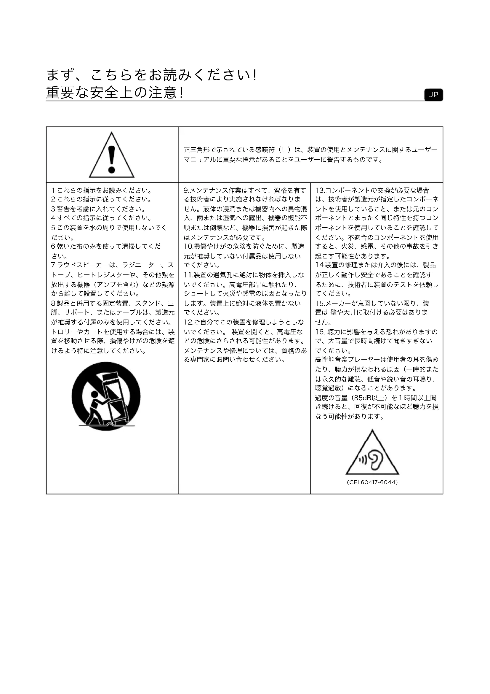 正三角形で示されている感嘆符(!)は、装置の使用とメンテナンスに関するユーザー マニュアルに重要な指示があることをユーザーに警告するものです。 1.これらの指示をお読みください。 2.これらの指示に従ってください。 3.警告を考慮に入れてください。 4.すべての指示に従ってください。 5.この装置を水の周りで使用しないでく