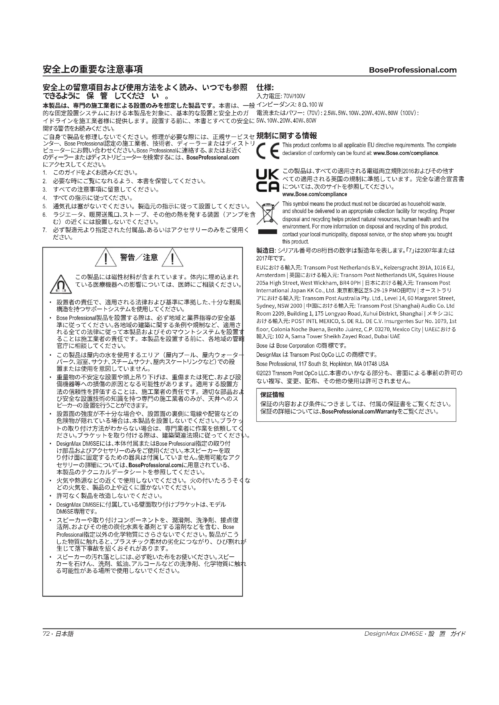 This product conforms to all applicable EU directive requirements. The complete declaration of conformity can be found at: www.Bose.com/compliance. この製品は、すべての適用される電磁両立規則2016およびその他す べての適用される英国の規制に準拠しています。完全な適合宣言書 に つ い て は 、次 の サ イ ト を 参 照 し て く だ さ い 。 www.Bose.com/compliance This symbol means the product must not be discarded as household waste, and should be delivered to an appropriate collection facility for recycling. Proper disposal and recycling helps protect natural resources, human health and the environment. For more information on disposal and recycling of this product, contact your local municipality, disposal service, or the shop where you bought this product. 製造日: シリアル番号の8桁目の数字は製造年を表します。「7」は 2007年または 2017年です。 EUにおける輸入元: Transom Post Netherlands B.V., Keizersgracht 391A, 1016 EJ, Amsterdam | 英国における輸入元: Transom Post Netherlands UK, Squires House 205a High Street, West Wickham, BR4 0PH | 日本における輸入元: Transom Post International Japan KK Co., Ltd. 東京都港区芝5-29-19 PMO田町IV | オーストラリ アにおける輸入元: Transom Post Australia Pty. Ltd., Level 14, 60 Margaret Street, Sydney, NSW 2000 | 中国における輸入元: Transom Post (Shanghai) Audio Co. Ltd Room 2209, Building 1, 175 Longyao Road, Xuhui District, Shanghai | メキシコに おける輸入元: POST INTL MEXICO, S. DE R.L. DE C.V. Insurgentes Sur No. 1079, 1st oor, Colonia Noche Buena, Benito Juárez, C.P. 03270, Mexico City | UAEにおける 輸入元: 102 A, Sama Tower Sheikh Zayed Road, Dubai UAE Bose は Bose Corporation の商 標です。 DesignMax は Transom Post OpCo LLC の商標です。 Bose Professional, 117 South St, Hopkinton, MA 01748 USA ©2023 Transom Post OpCo LLC.本書のいかなる部分も、書面による事前の許可の ない複写、変更、配布、その他の使用は許可されません。
