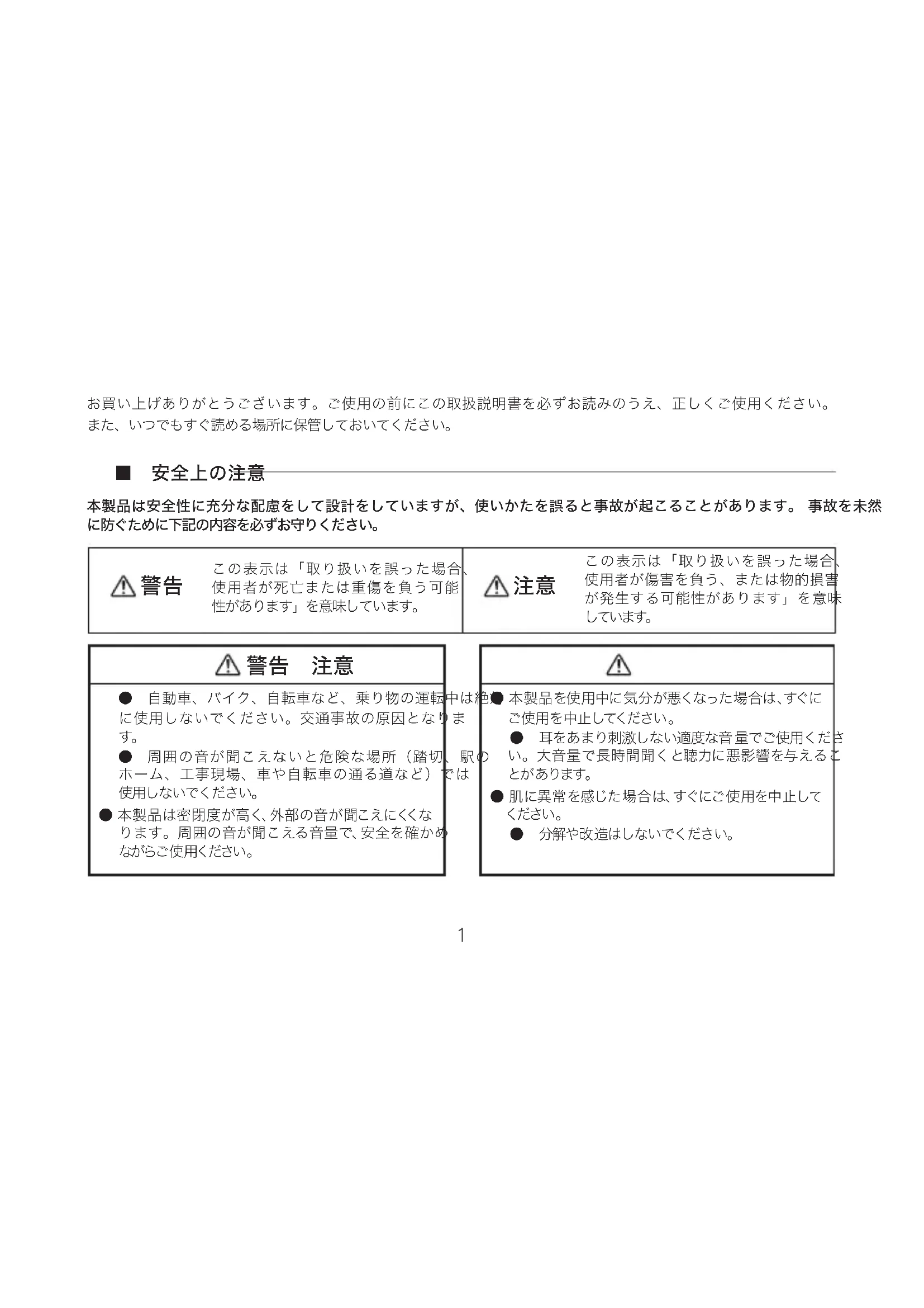 ⁃ 周囲の音が聞こえないと危険な場所(踏切、駅の ホーム、工事現場、車や自転車の通る道など)では 使用しないでください。 ⁃ 本製品は密閉度が高く、外部の音が聞こえにくくな ります。周囲の音が聞こえる音量で、安全を確かめ ながらご 使 用ください 。 ⁃ 本製品を使用中に気分が悪くなった場合は、すぐに ご 使 用 を 中 止 してください 。 ⁃ 耳をあまり刺激しない適度な音 量でご使用くださ い。大音量で長時間聞くと聴力に悪影響を与えるこ
