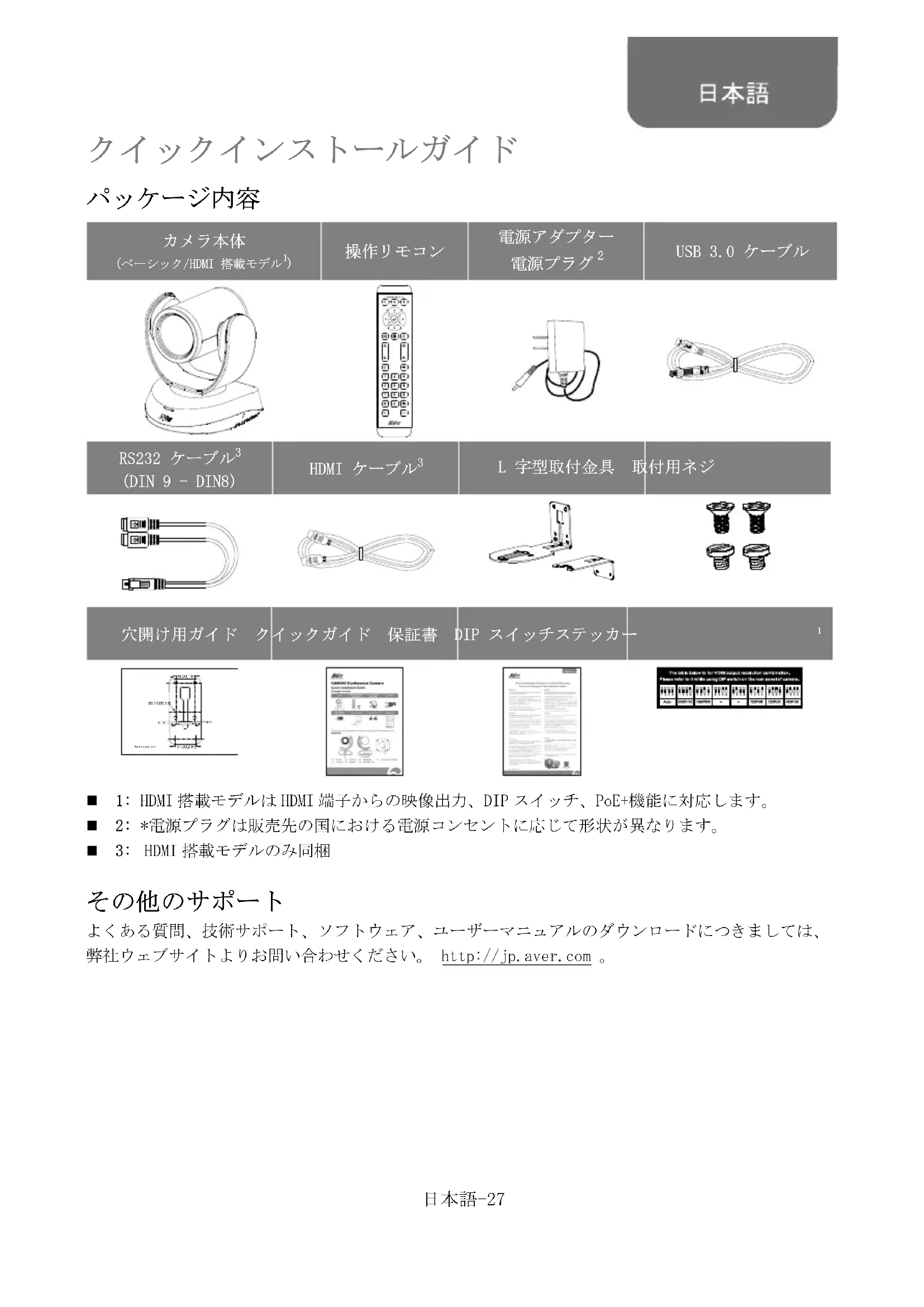 www.aver.com 新北市土城区大安路 157 号 8 楼 电话:(02)2269-8535 日本語-27 クイックインストールガイド