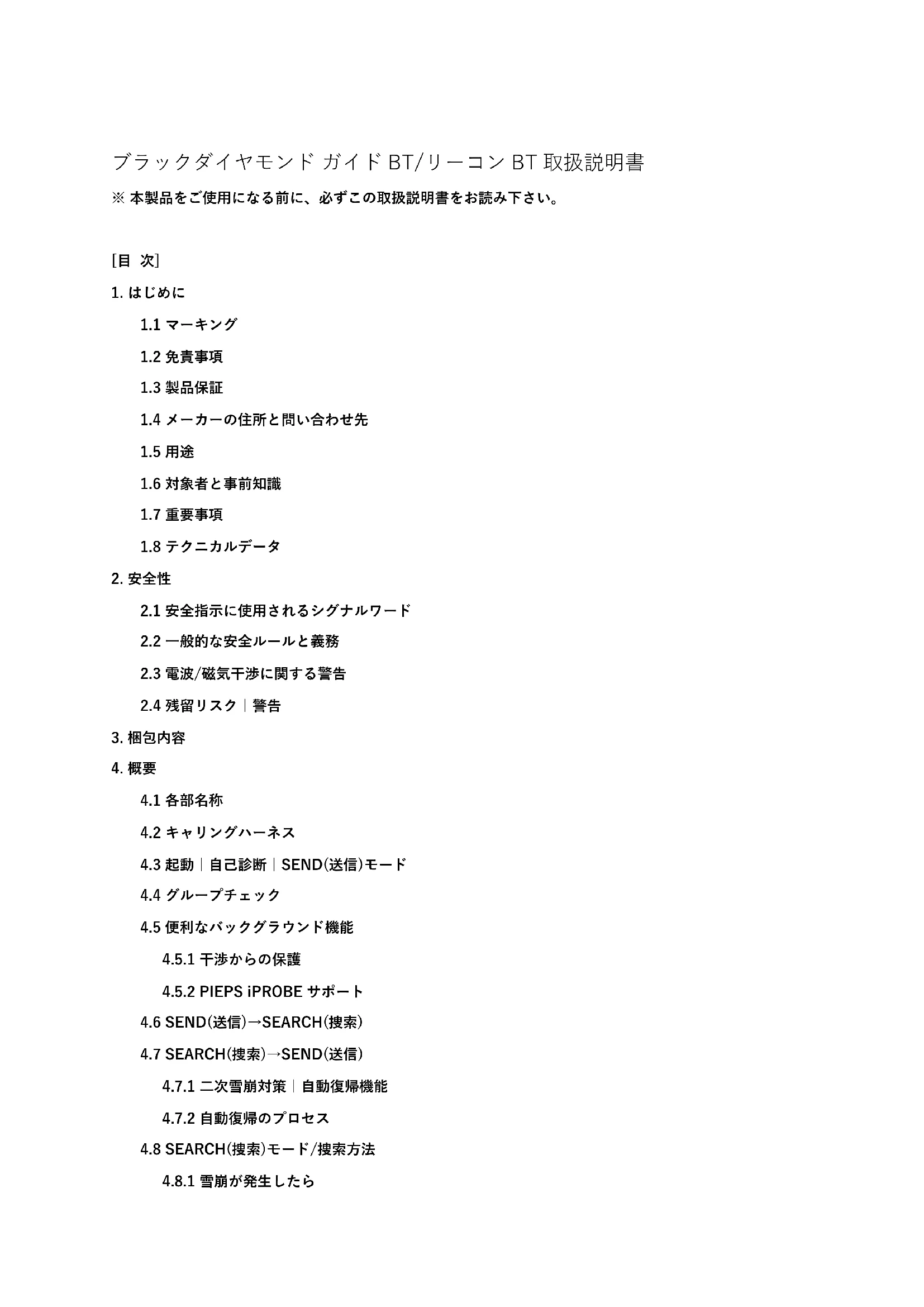 この度はブラックダイヤモンド ガイド BT/リーコン BT をご購入いただき、ありがとうございます。本機は高機 能かつ信頼性の高い雪崩ビーコン(雪崩トランシーバー)です。操作性にも優れ、フィールドで鍛えられた以下のよ うな機能を備えています。 (1) 3 アンテナテクノロジー (2) 迅速で安定したシグナル受信を実現する広い円形受信範囲 (3) 複数埋没時の難しいシグナル受信も完璧に処理 (4) マーク機能 (5) 自己診断機能 (6) 使いやすいグループチェック (7) 自動磁気干渉防止 (8) 自動復帰機能 (9) i プローブサポート (10) PIEPS アプリによるデバイス管理 ガイド BT にはプロ向けの下記機能が追加で搭載されています。 (11) スキャン機能 (12) アナログモード (13) 埋没者選択 (14) グループチェック プロモード 雪崩ビーコン(雪崩トランシーバー)は雪崩からあなたを守るものではありません!雪崩回避の詳しい知識を習得す ることは、雪崩遭遇時の埋没者捜索を定期的に訓練するのと同様に不可欠です。この取扱説明書ではガイド BT/ リーコン BT を使用する場合の手順とヒントのみを解説しています。雪崩遭遇時の基本的な対処方法は、専門家の 出版物や雪崩講習会の資料で解説されている内容に従って下さい。 本機は安全で操作性に優れた最先端の製品ですが、使い方を誤ると危険に晒されるおそれがあります。第 2 章で は起こりうる危険を解説するとともに、随所に安全指示が記載されています。この取扱説明書は 本機を安全にご 使用いただくための必需品です。取扱説明書中の安全指示を常に厳守して下さい。 本機をご使用になる前に、こ の取扱説明書を熟読し、内容を理解して下さい。 ブラックダイヤモンドイクイップメント社は、取扱説明書の技術的な誤りや印刷上の誤りについて責任を負いませ ん。また取扱説明書の配布、内容、使用により生じた損害について、直接的/間接的を問わず責任を負いません。 copyright © Black Diamond Equipment, 2022この取扱説明書の翻訳は著作権により保護されています。全ての権利、とりわけ複製権、頒布権、翻訳権は留保さ れています。この文書のいかなる箇所もブラックダイヤモンドイクイップメント社の書面による同意なしに、いか なる形式(コピー、マイクロフィルム、その他の方法)でも、電子システムを使用して複製、保存、加工、複製、配 布することはできません。違反した場合、刑事罰が科せられることがあります。