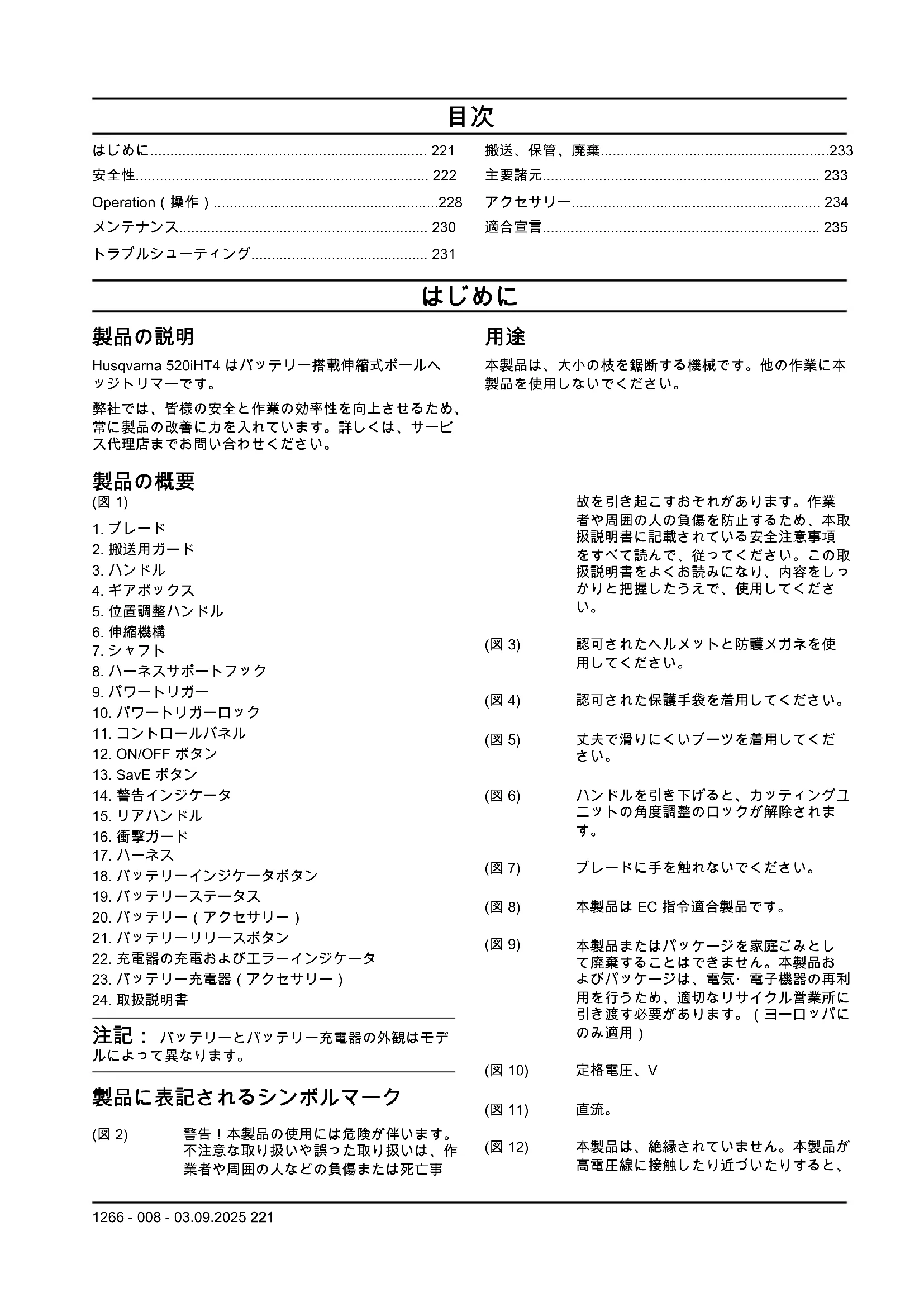 - 機器の操作中は子供や周囲の人から十分な距離をと ってください。注意が散漫になって、操作ミスを引 き起こす可能性があります。 222 1266 - 008 - 03.09.2025電気保安