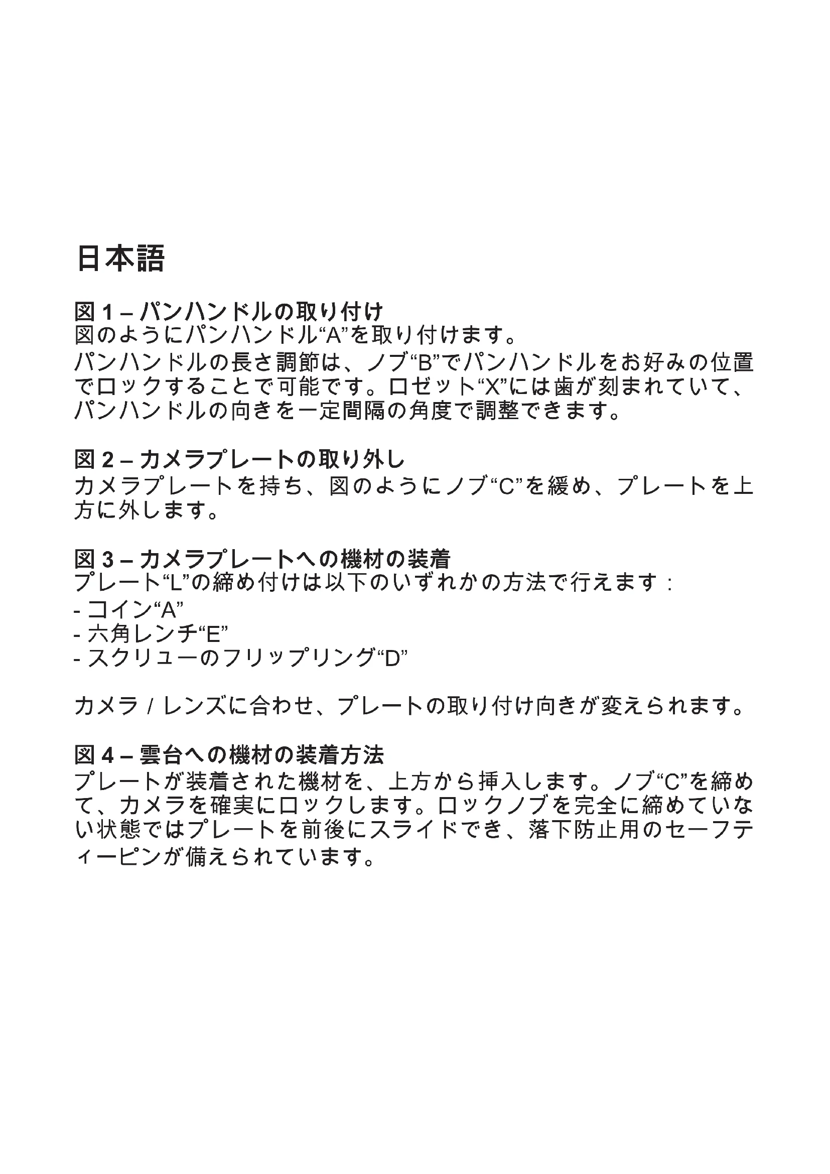 図 3 – カメラプレートへの機材の装着 プレート“L”の締め付けは以下のいずれかの方法で行えます: - コイン“A” - 六角レンチ“E” - スクリューのフリップリング“D” カメラ/レンズに合わせ、プレートの取り付け向きが変えられます。 図 4 – 雲台への機材の装着方法 プレートが装着された機材を、上方から挿入します。ノブ“C”を締め て、カメラを確実にロックします。ロックノブを完全に締めていな い状態ではプレートを前後にスライドでき、落下防止用のセーフテ ィーピンが備えられています。図 5-6-7-8-9-10-11-12-13-14 – カウンターバランスシステム 本雲台には、ご使用の機材の重心バランスを調整するスプリング式カ ウンターバランスシステム(ON/OFFおよび7段階調整)が搭載されて います。雲台自体は4kgまでの荷重を支えることができ、バランスシ ステムは2.5kgまでの機材のバランス調整ができます。カウンターバラ ンスシステムON/OFFどちらの状態でも使用できます。 図 5 カウンターバランスシステムOFFの場合、標準的なフルード雲台の ような動きになります。
