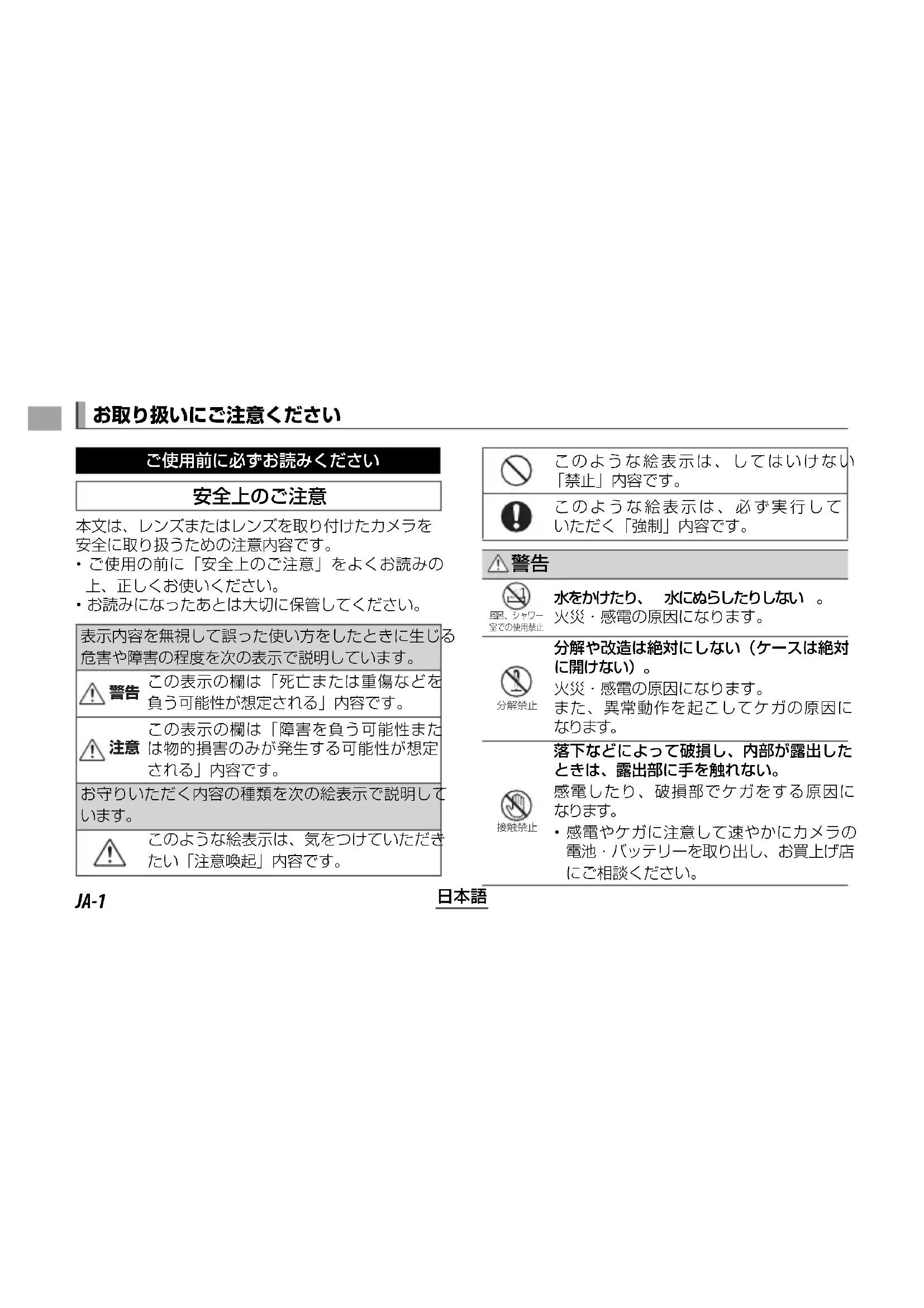 本文は、レンズまたはレンズを取り付けたカメラを 安全に取り扱うための注意内容です。