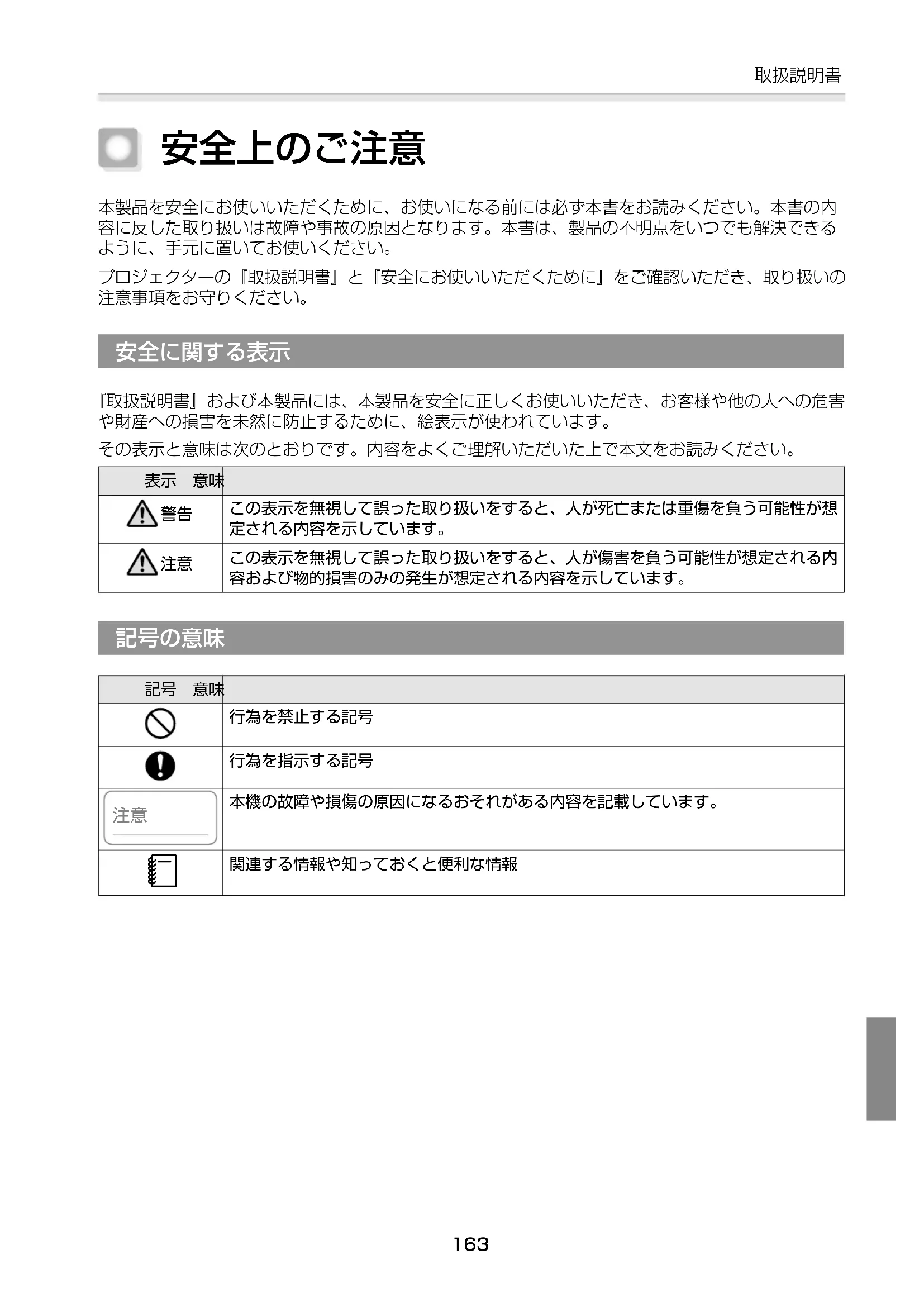 本製品を安全にお使いいただくために、お使いになる前には必ず本書をお読みください。本書の内 容に反した取り扱いは故障や事故の原因となります。本書は、製品の不明点をいつでも解決できる ように、手元に置いてお使いください。 プロジェクターの『取扱説明書』と『安全にお使いいただくために』をご確認いただき、取り扱いの 注意事項をお守りください。