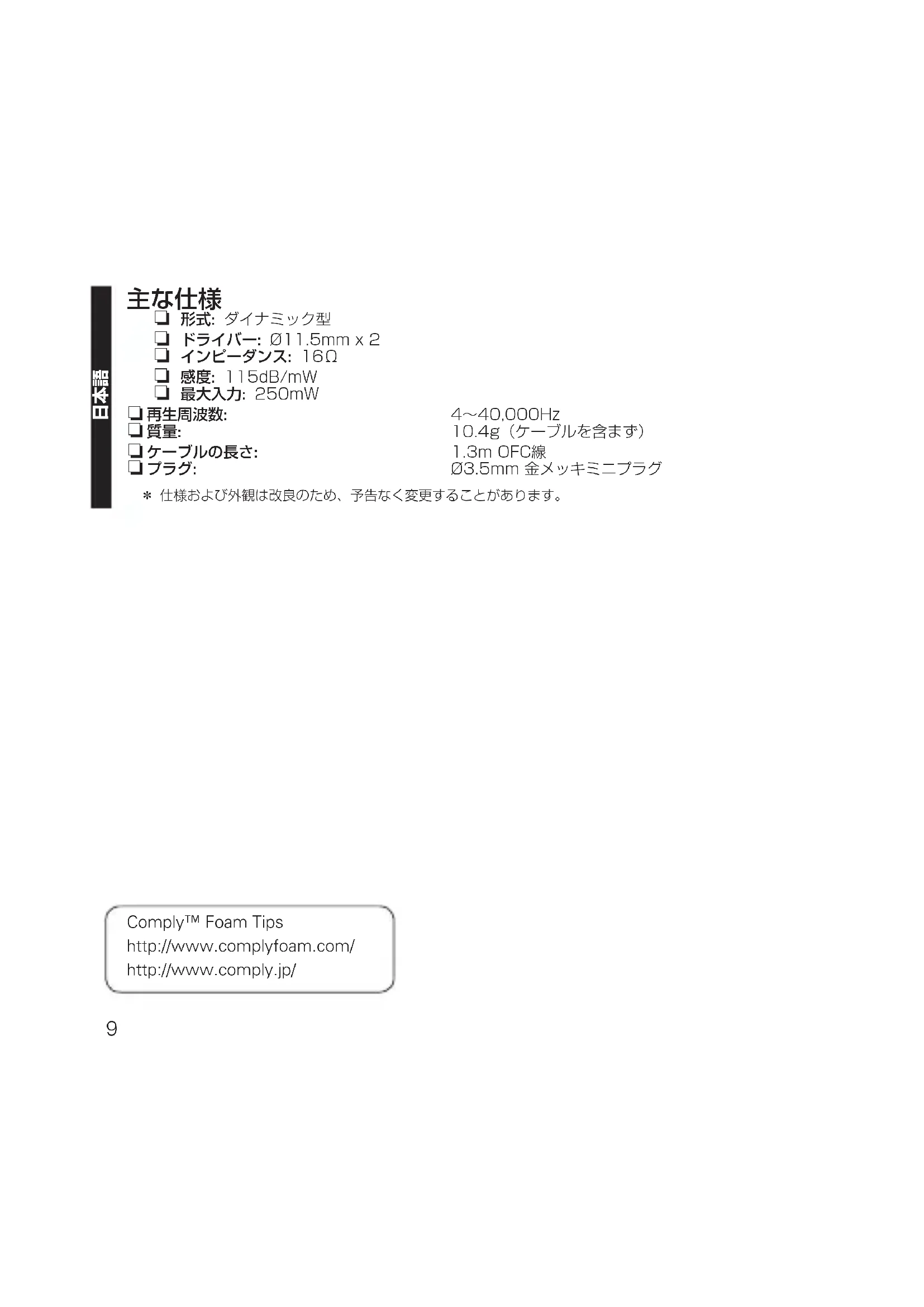 n 形式: ダイナミック型 n ドライバー: Ø11.5mm x 2 n インピーダンス: 16Ω n 感度: 115dB/mW n 最大入力: 250mW n 再生周波数: 4~40,000Hz n 質量: 10.4g(ケーブルを含まず) n ケーブルの長さ: 1.3m OFC線 n プラグ: Ø3.5mm 金メッキミニプラグ z 仕様および外観は改良のため、予告なく変更することがあります。 Comply™ Foam Tips http://www.complyfoam.com/ http://www.comply.jp/ AH-C820EM_00A_160627.indd 9 2016/06/27 10:25:2210