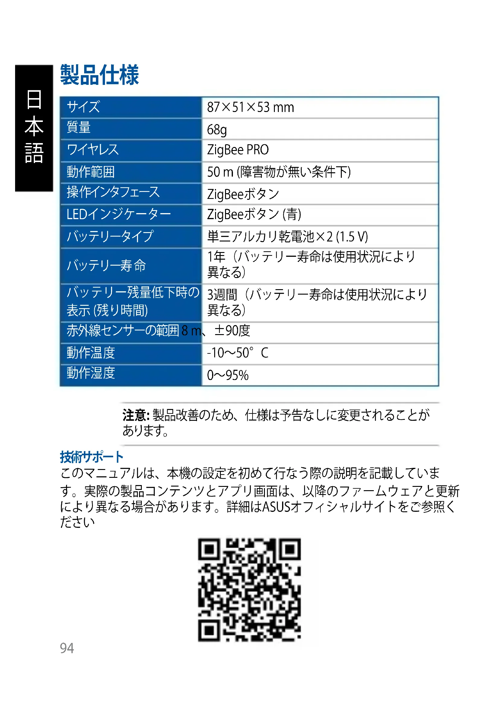 赤外線により物体の動きを検出します。本機の検出範囲は角 度 ± 9 0 度 、距 離 8 m で す 。 ZigBeeボタン このボタンを押してホームゲートウェイに接続します。5秒間ほ ど長押しすると、本機をリセットします。 注意: ASUS Smart Homeデバイスを完全に削除す るには、そのデバイスをリセットし、対応アプリか らも削 除 する 必 要が あります。 95日
