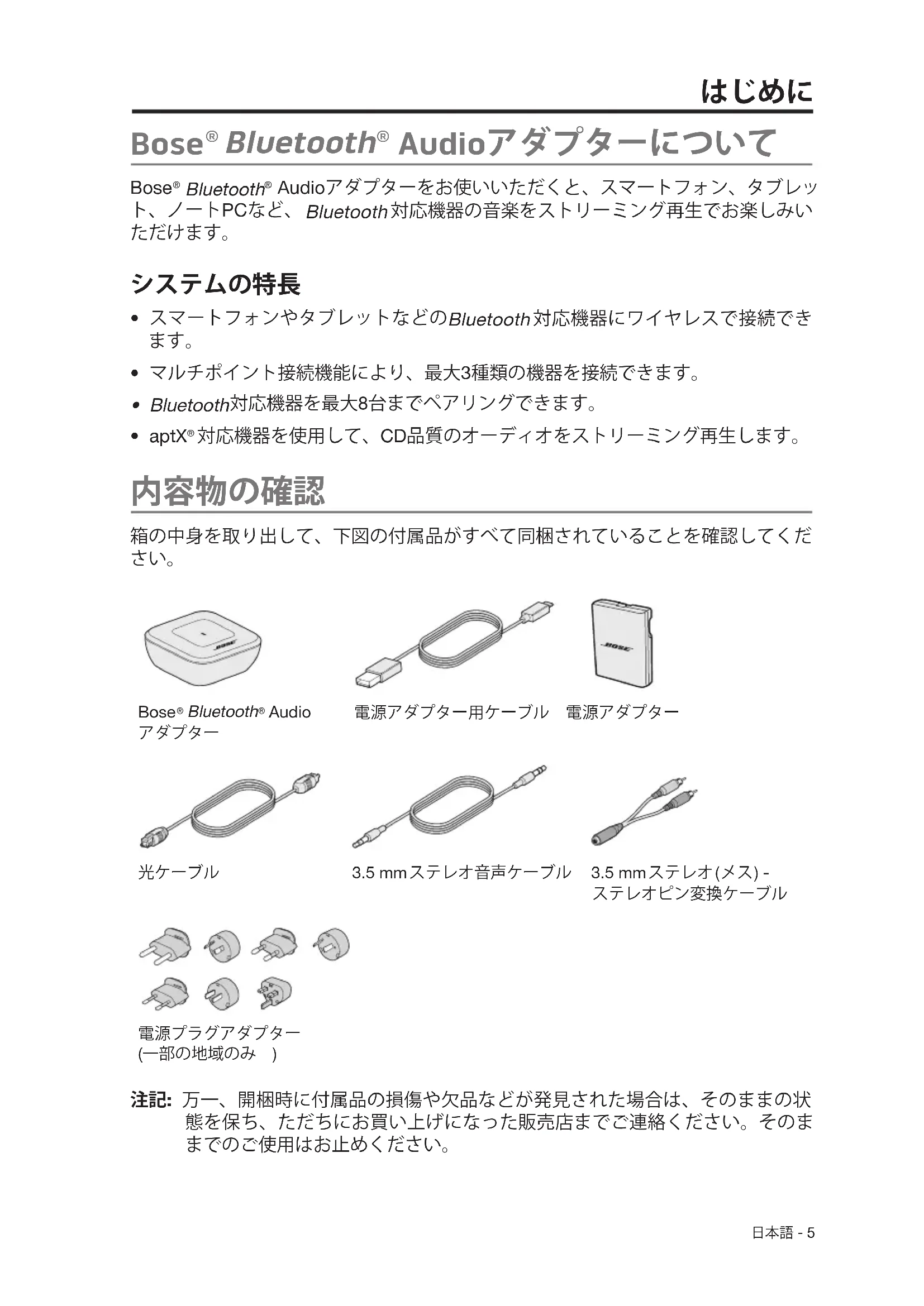 - Bluetooth 対応機器を最大8台までペアリングできます。• aptX 対応機器を使用して、CD品質のオーディオをストリーミング再生します。 箱の中身を取り出して、下図の付属品がすべて同梱されていることを確認してくだ